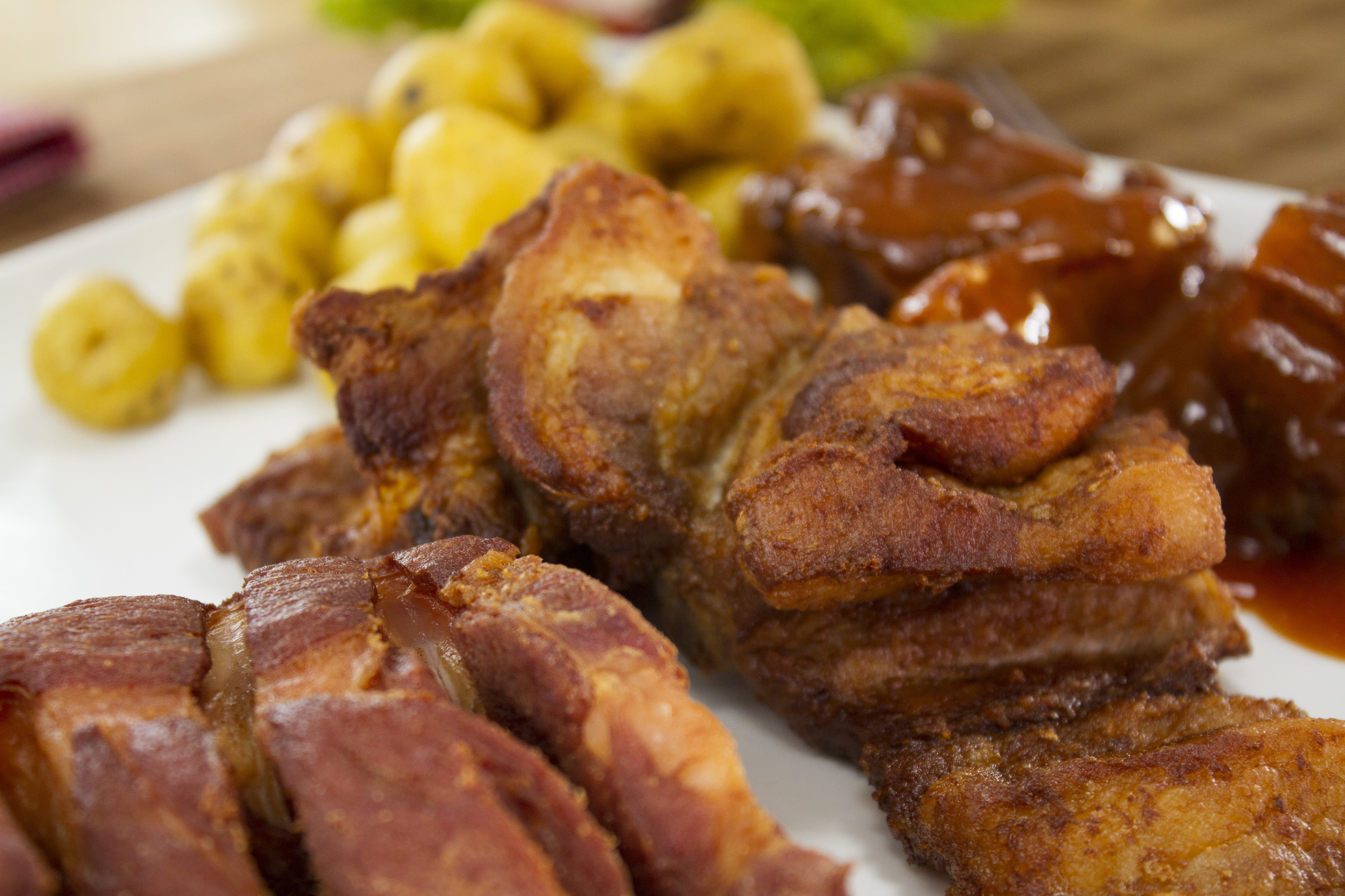 Costilla frita 300 g, costilla ahumada 200 g, costilla BBQ 300 g, acompañadas de papita amarilla.