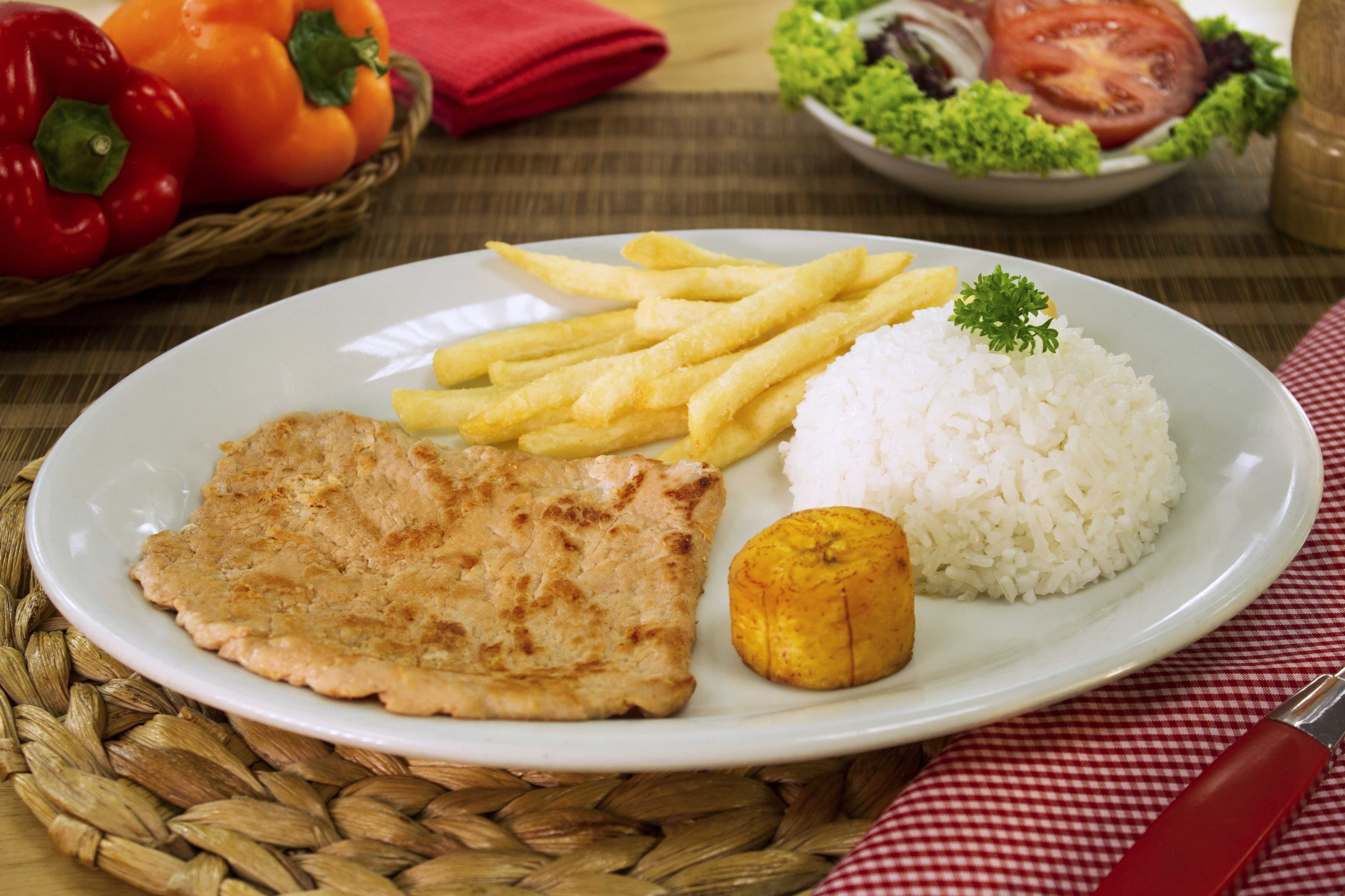Lomo de cerdo asado a la plancha acompañado de arroz, papa francesa, ensalada y maduro. La cantidad de los acompañamientos irá de acuerdo al tamaño que selecciones.