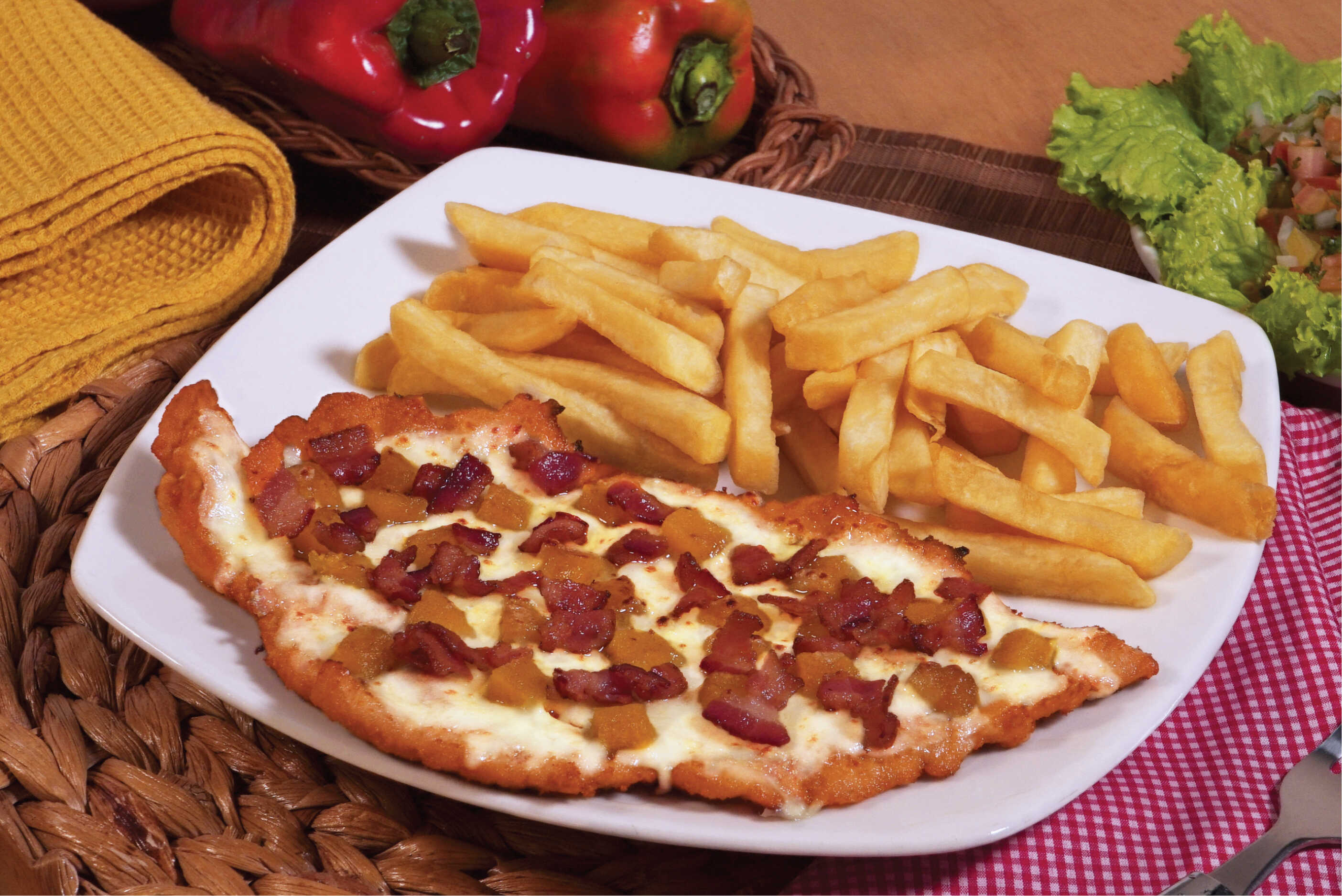 Chuleta gratinada con mozzarella, maduro, tocineta y papa francesa. Escoge el tipo de carne.