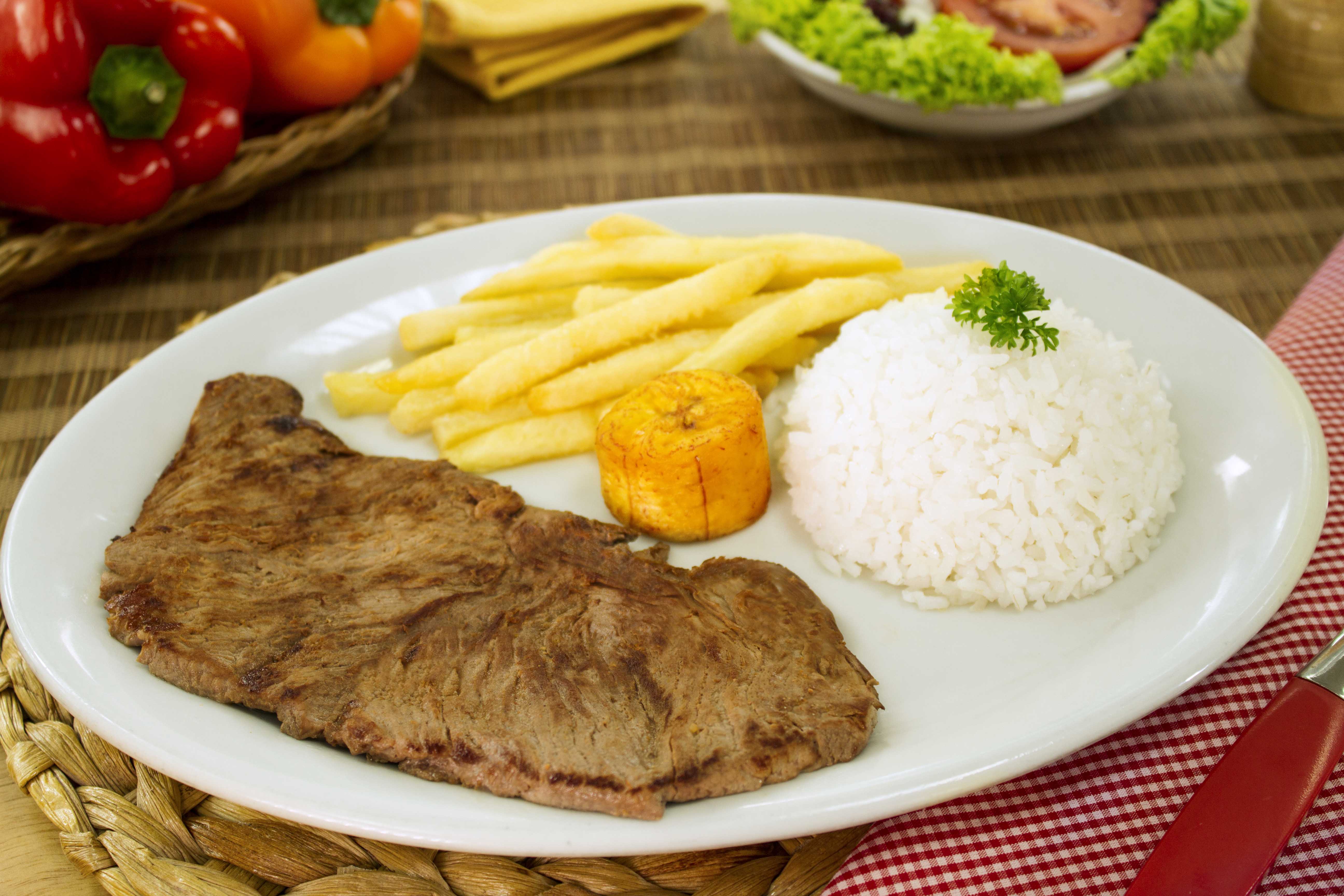 Lomo viche de res asado a la plancha acompañado de papa francesa, arroz, ensalada y maduro. La cantidad de los acompañamientos irá de acuerdo al tamaño que selecciones.