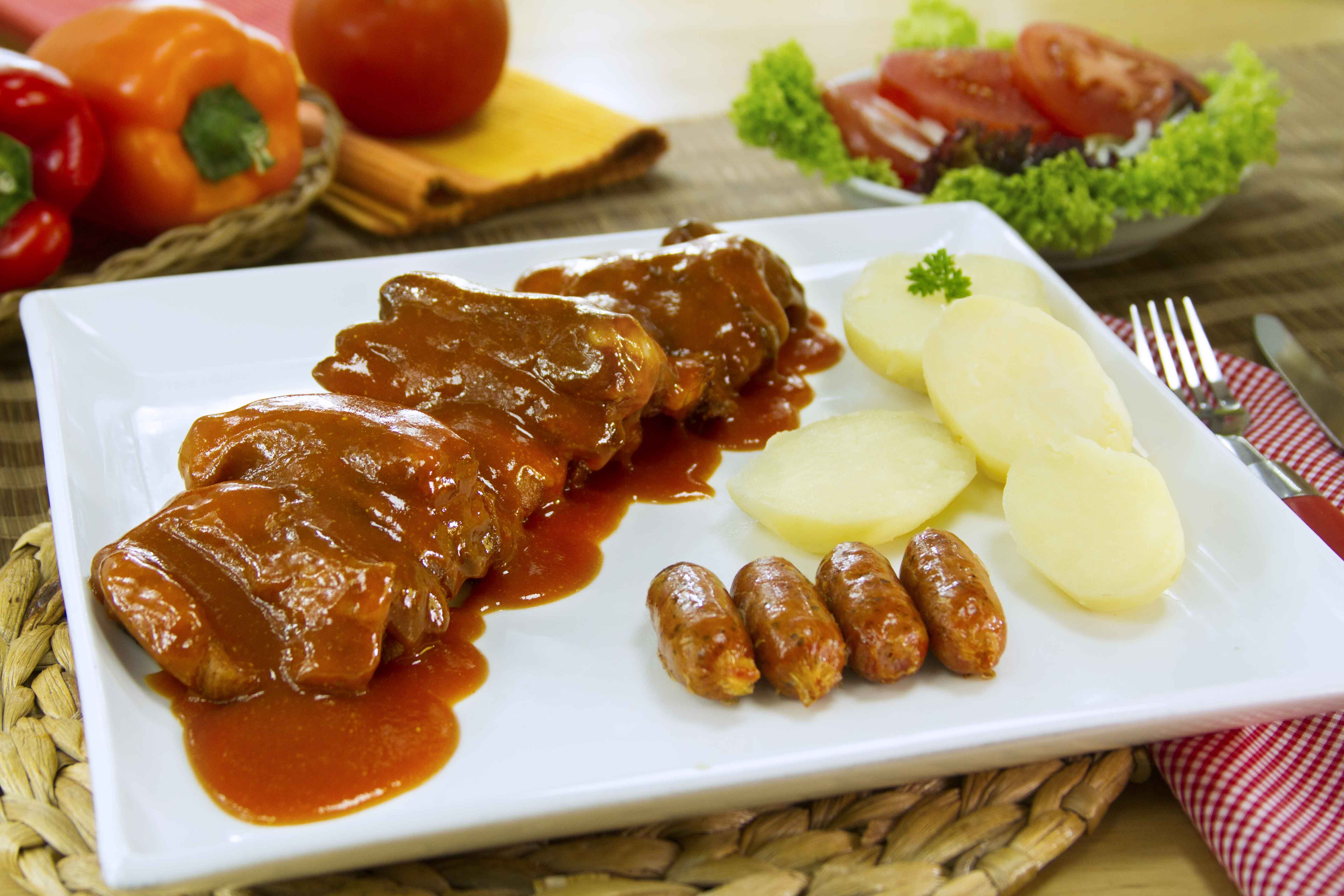 500 g Costilla de cerdo frita en salsa BBQ, choricitos coctel y papa cocida.