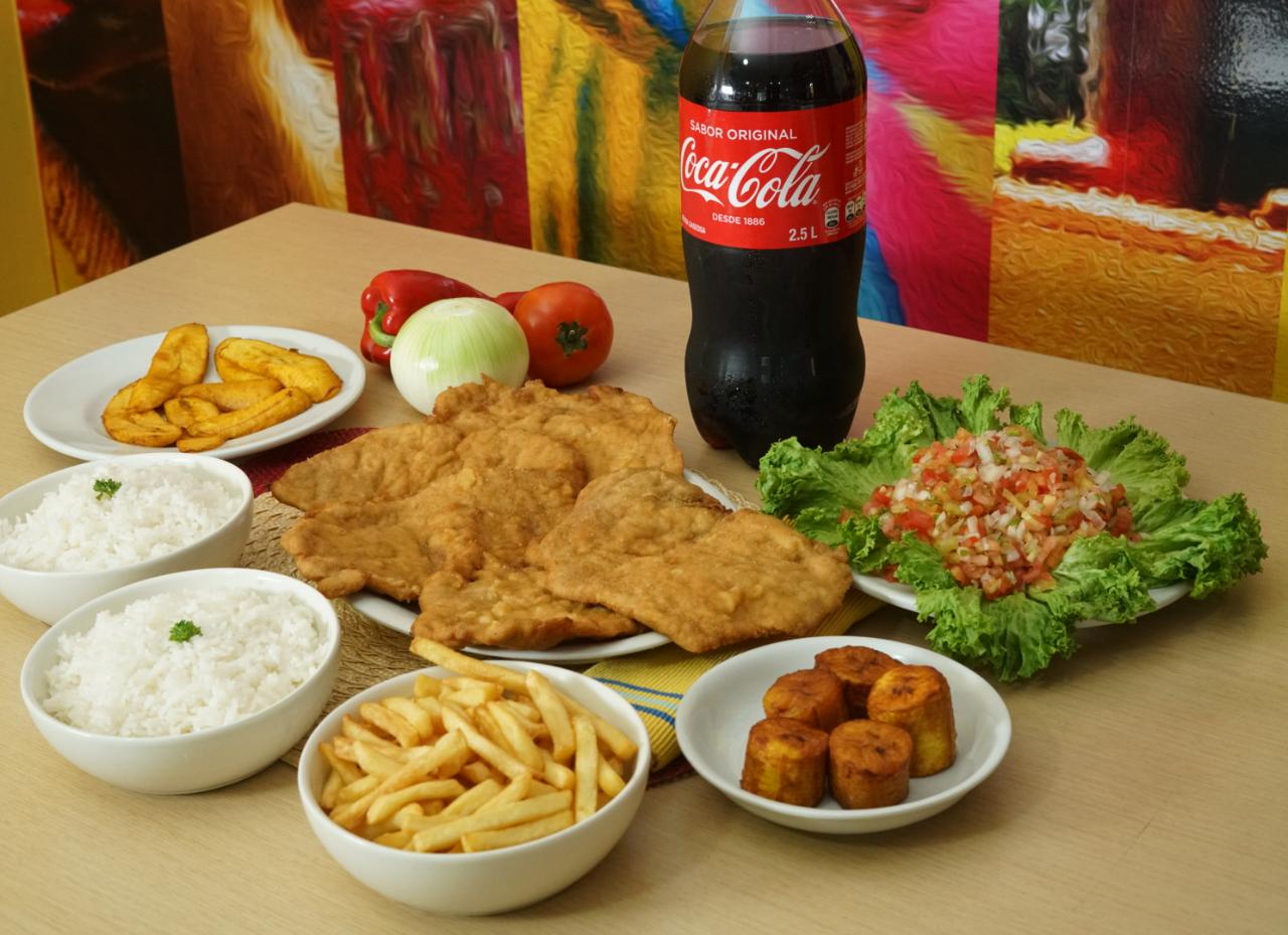Una caja con 5 Chuletas de 125 gr de Cerdo o Pollo, acompañadas de arroz, papa francesa, ensalada y maduro; Tajadas de platano Maduro y Coca Cola 2L