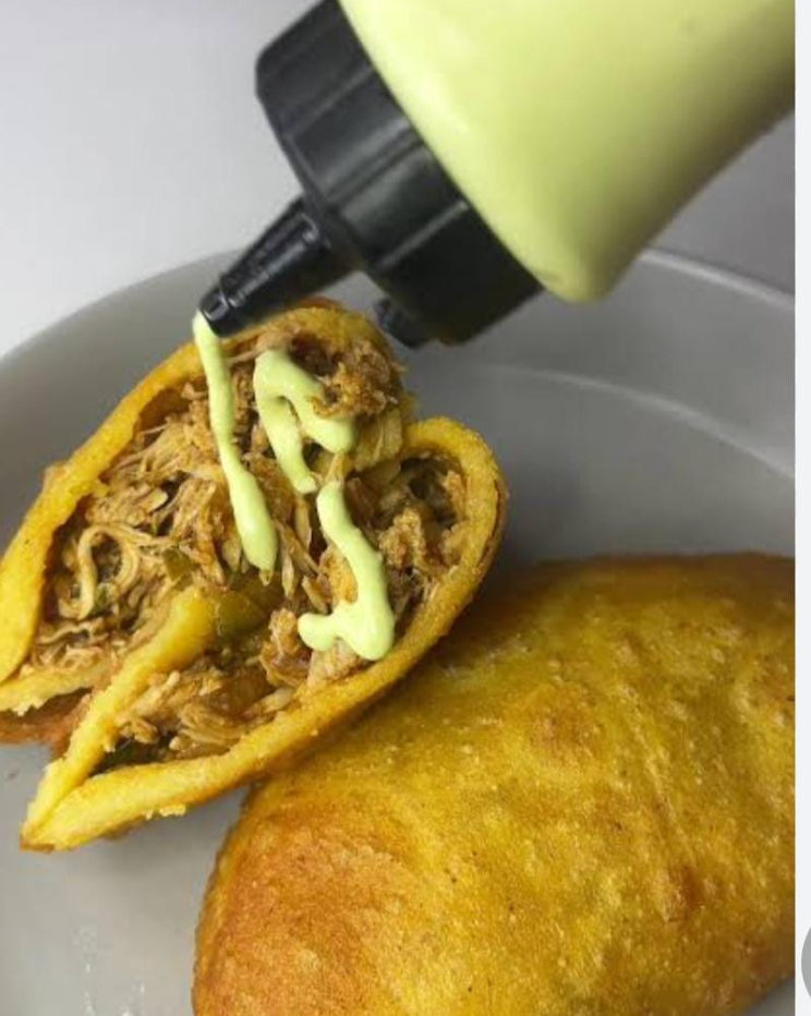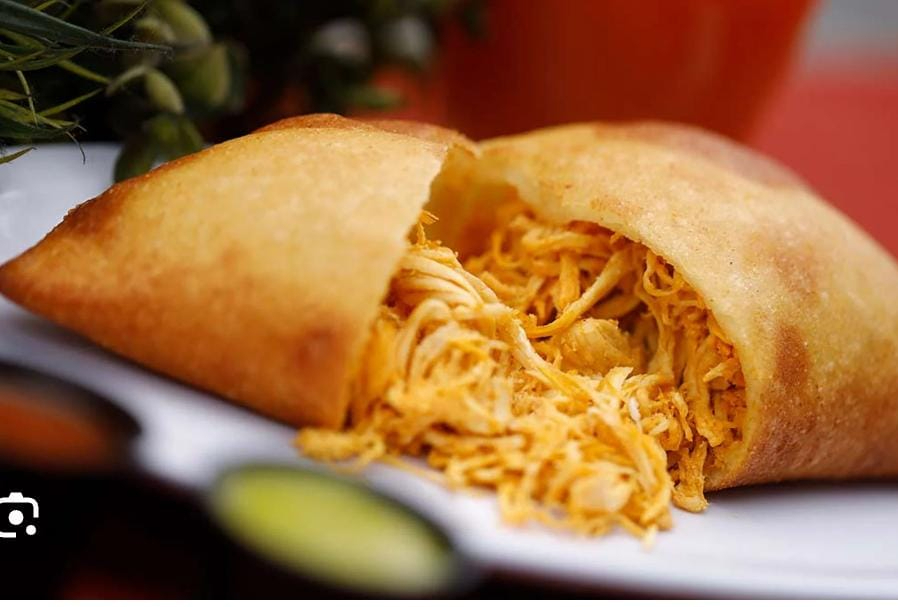 Deliciosa empanada venezolana acompañada de pollo desmechado.