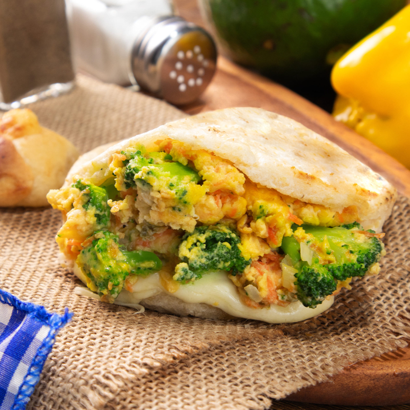 Arepa de maiz, rellena con queso mozzarella, huevos revueltos y vegetales frescos, nutritiva y deliciosa, perfecta para una dieta equilibrada. Te obsequiamos una mini nona