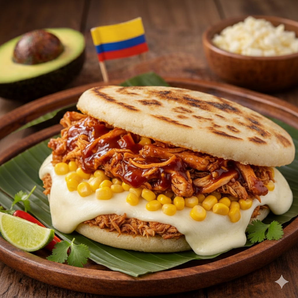 Deliciosa arepa acompañada de pollo en salsa BBQ, queso y maicitos.