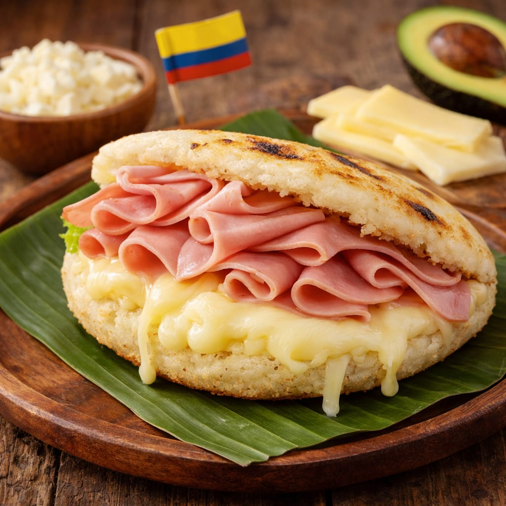 Deliciosa arepa acompañada de pollo desmechado, champiñones, queso y jamón especial.