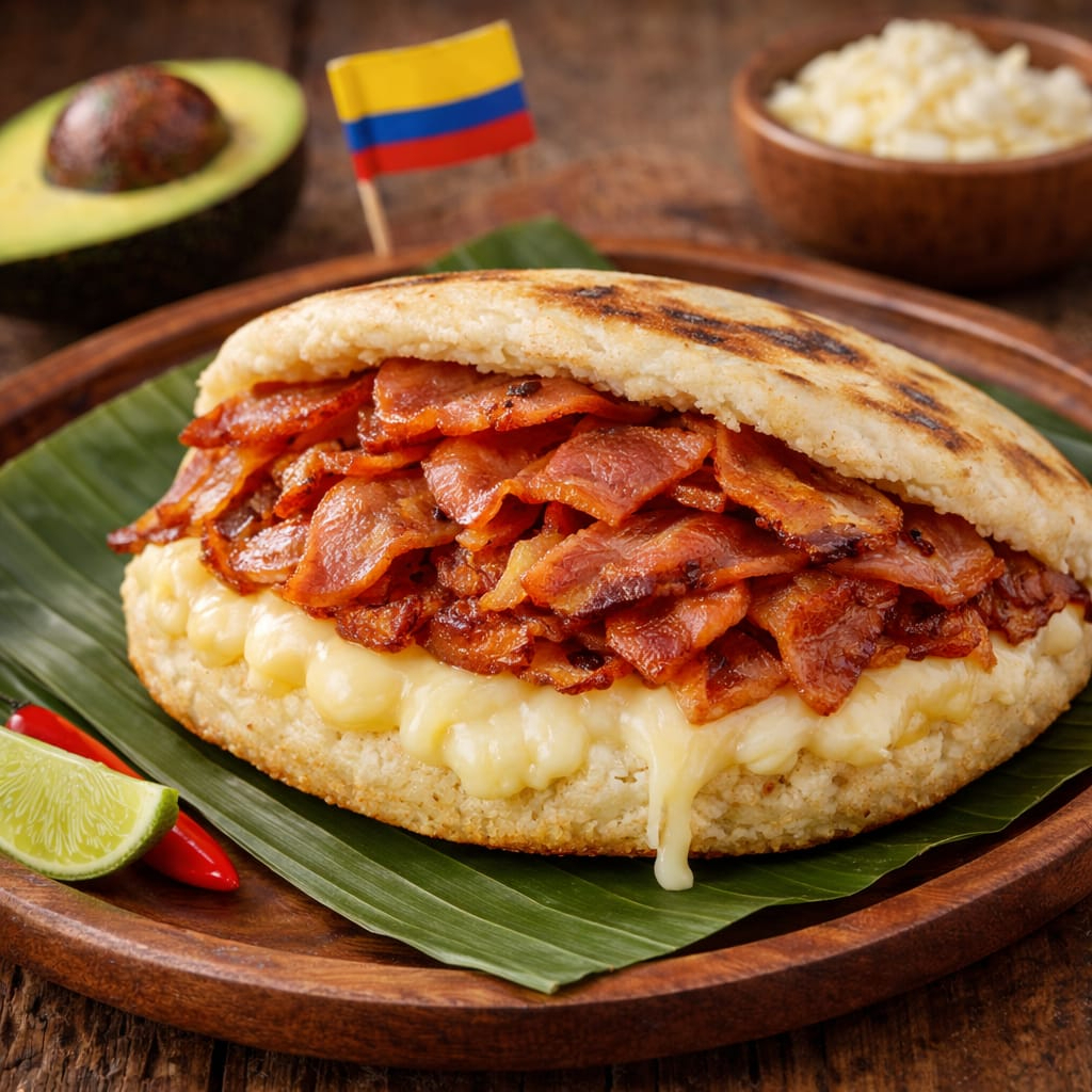 Deliciosa arepa acompañada de tocineta, queso y lechuga.