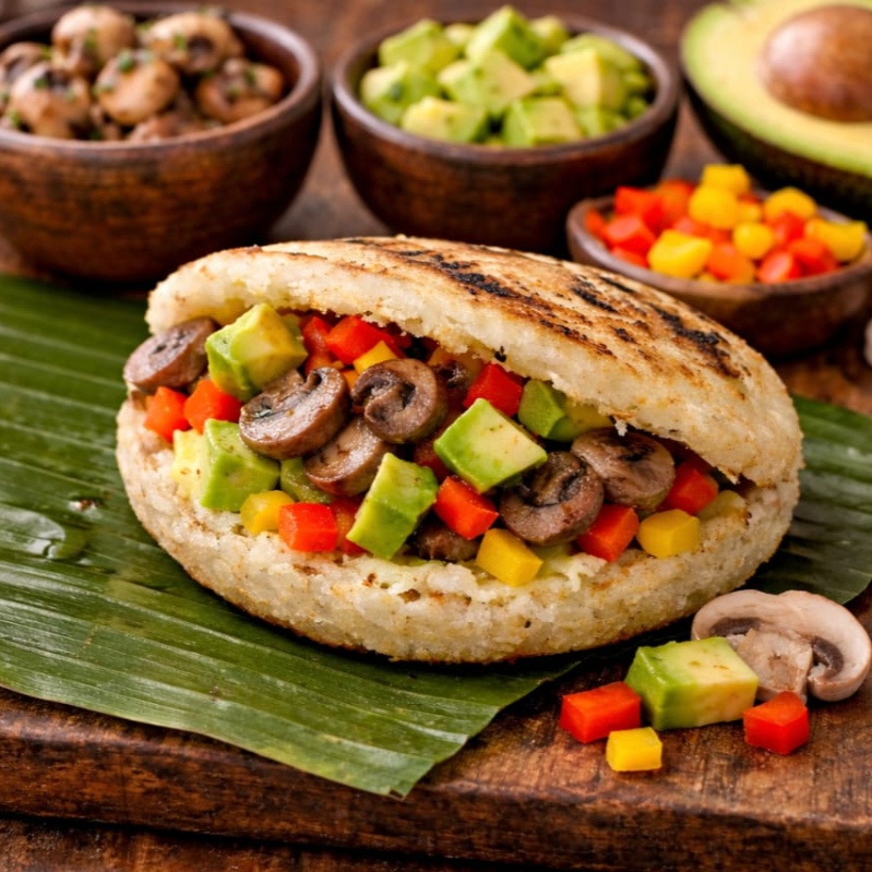 Deliciosa arepa acompañada de champiñones, maicitos, lechuga y aguacate.