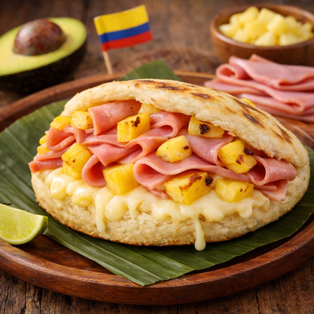 Deliciosa arepa acompañada de piña caramelizada, queso y jamón especial.