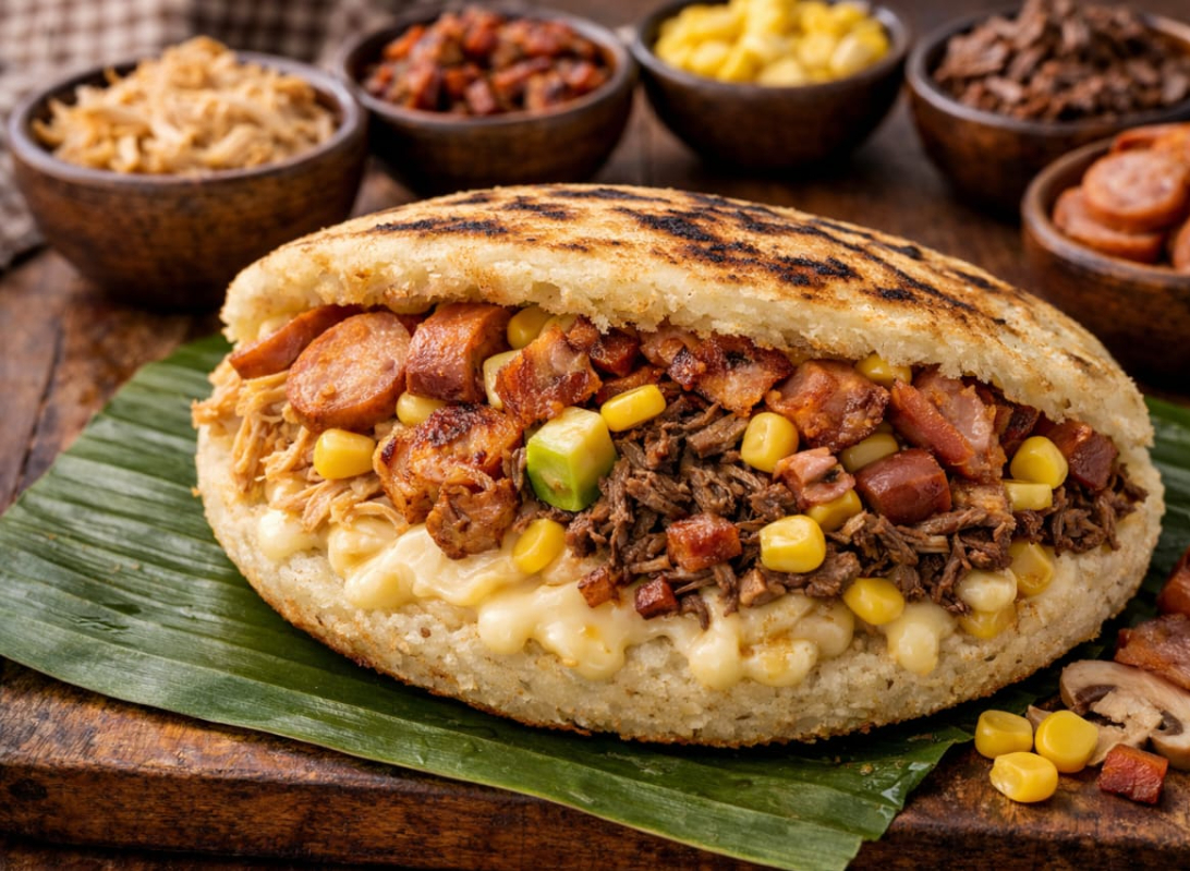 Deliciosa arepa acompañada de pollo desmechado, carne desmechada, huevo de codorniz, maicitos, tocineta y salchicha ranchera.