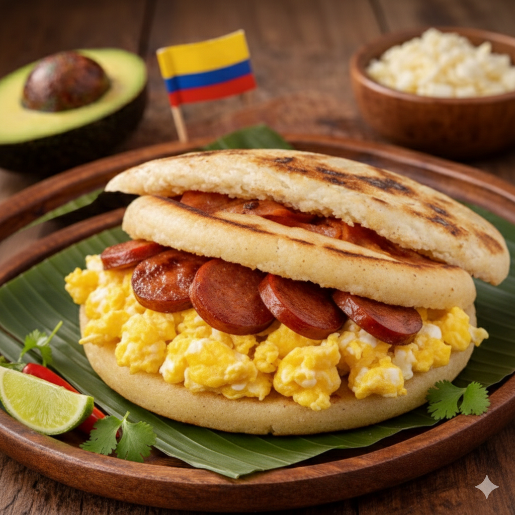Deliciosa arepa acompañada de huevos revueltos, salchicha ranchera y queso.