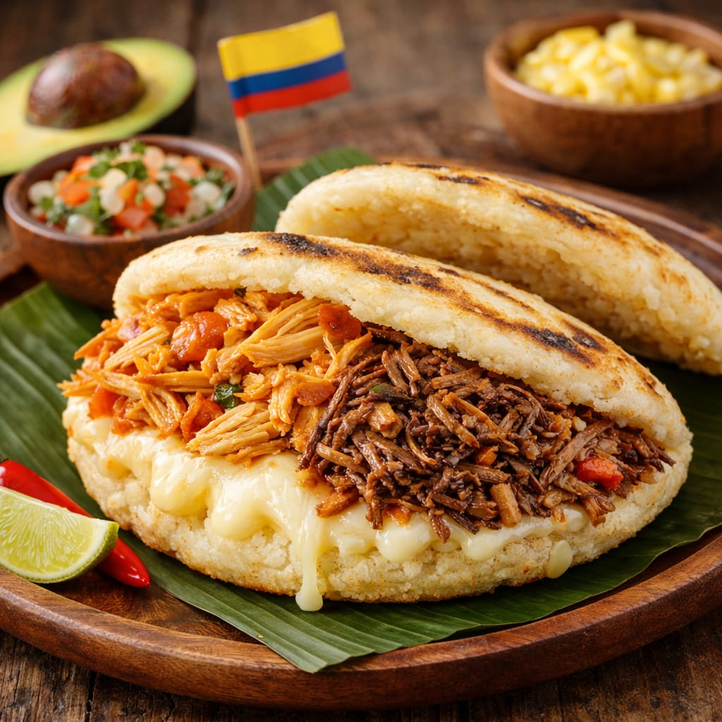 Deliciosa arepa acompañada de pollo desmechado, queso, lechuga, carne desmechada y maicitos.