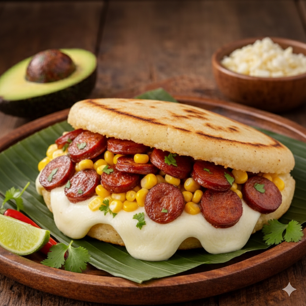 Deliciosa arepa acompañada de chorizo, salchicha ranchera, maicitos y queso.