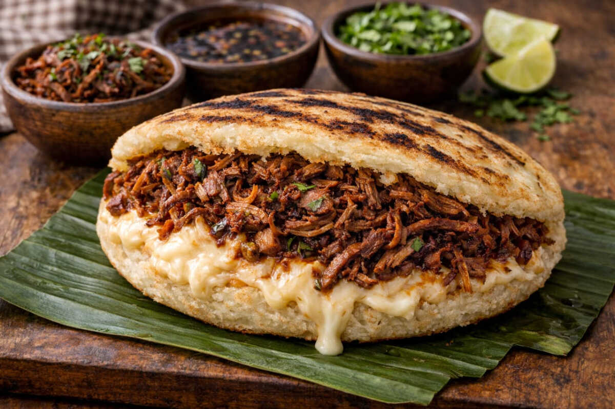 Deliciosa arepa acompañada de carne desmechada, queso y lechuga.