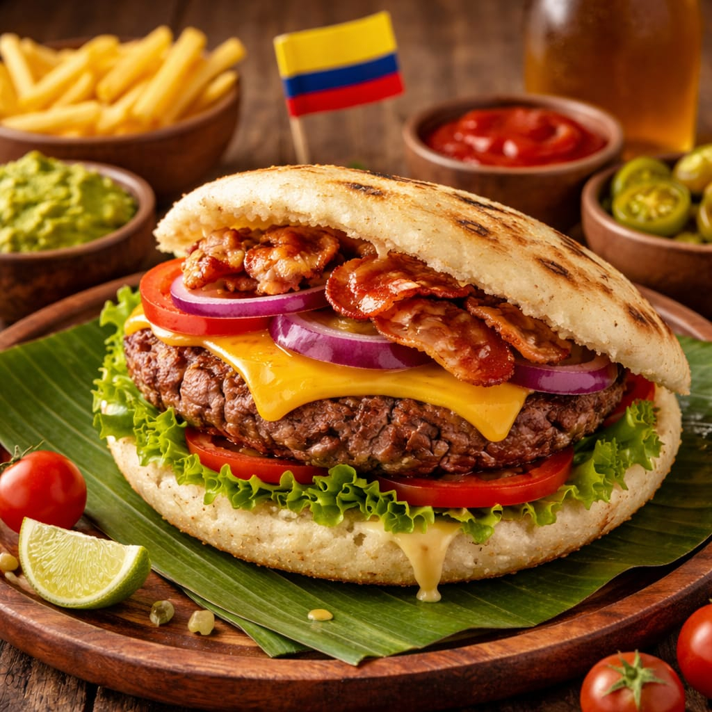 Deliciosa arepa acompañada de carne de hamburguesa, queso, tocineta, lechuga y ripio de papa.