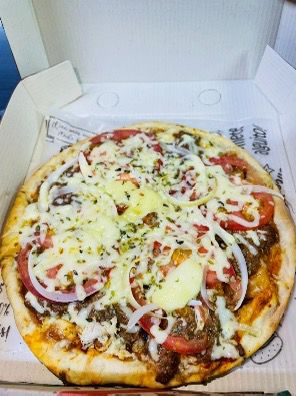 Pollo, queso, cebolla, ripio y salsa de la casa (ajo).