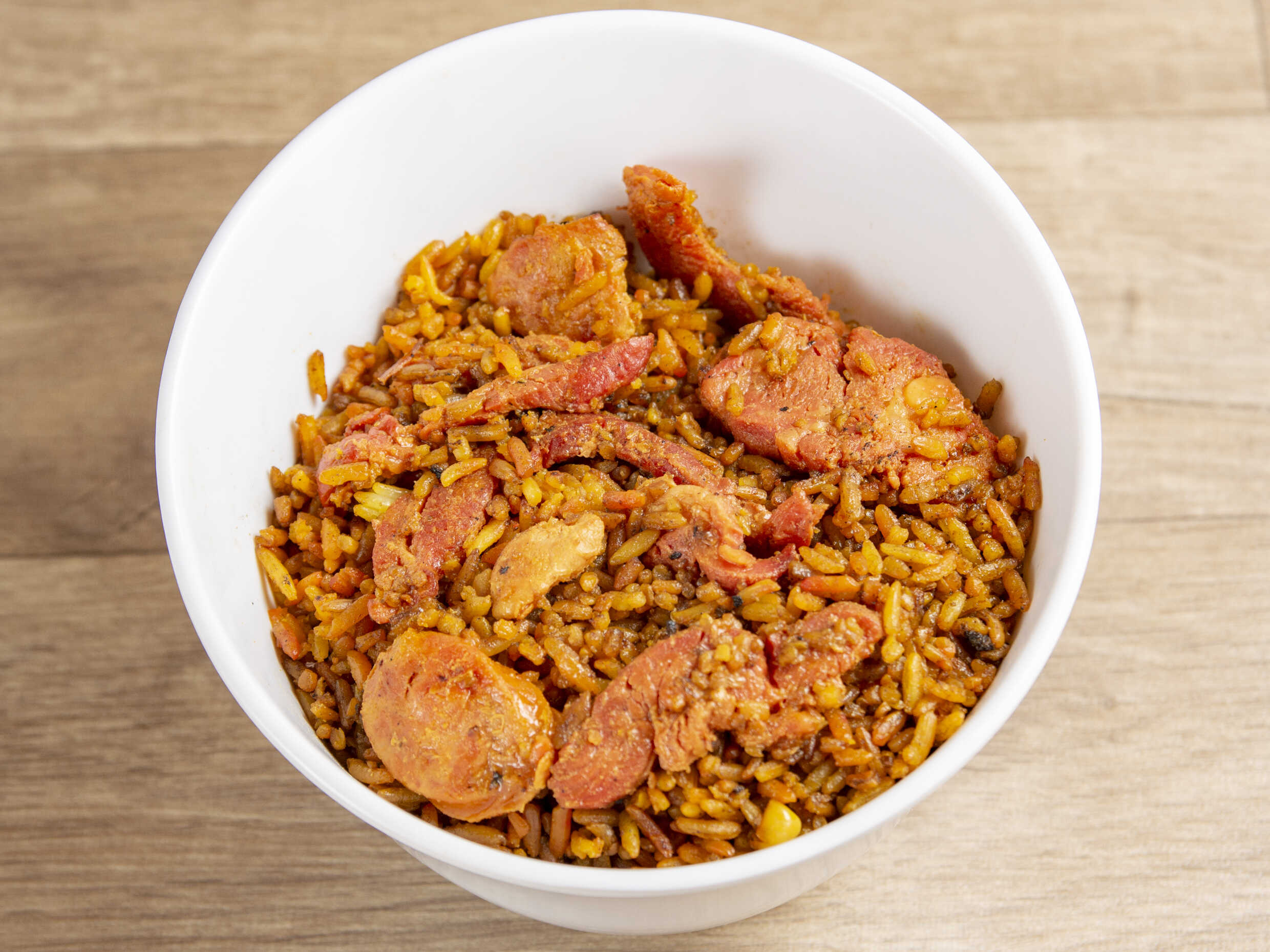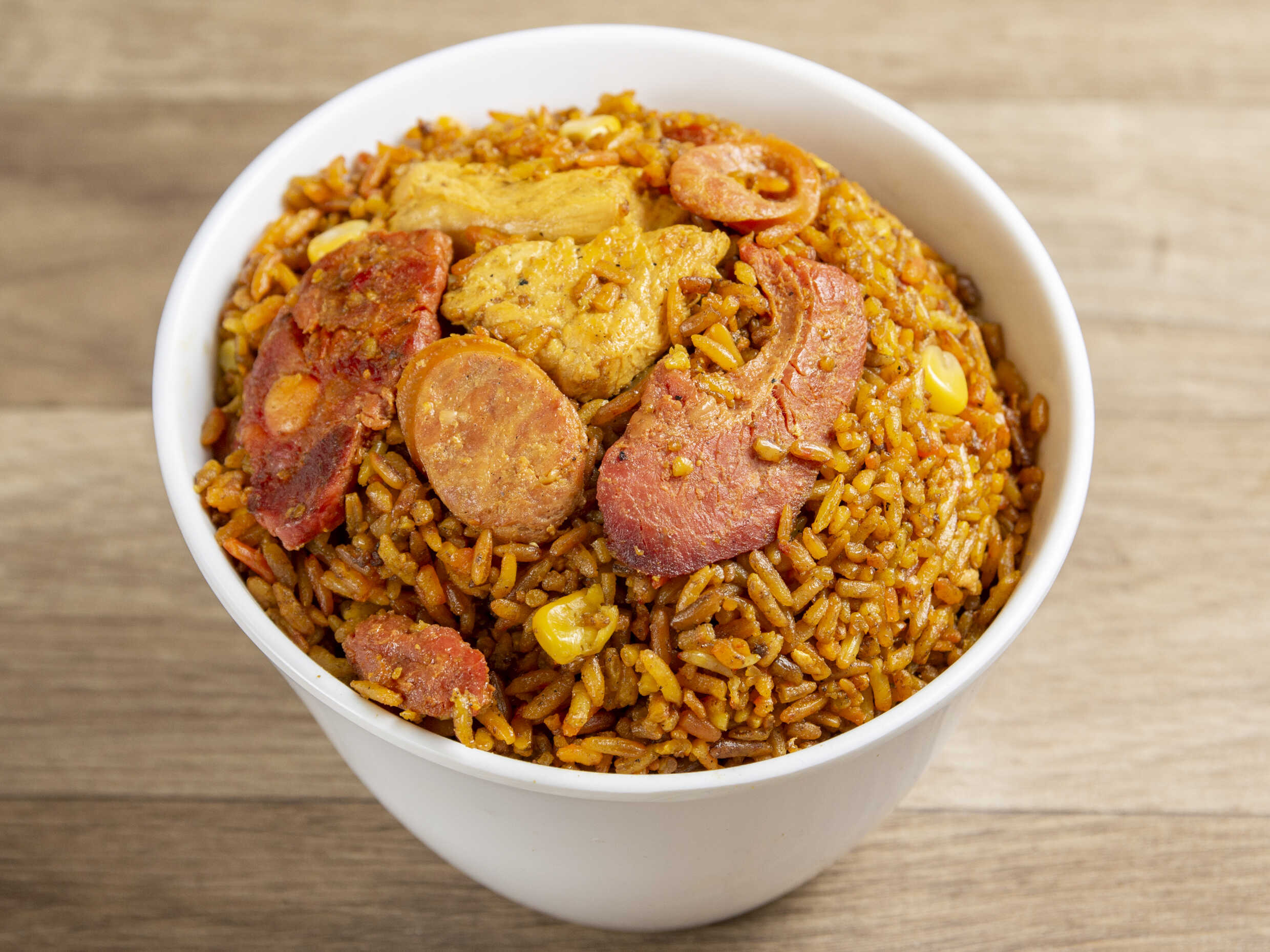 Delicioso Arroz con Pollo, Pernil de Cerdo, Costilla Ahumada, Salchicha Ranchera, Tocineta, Platano Maduro, Maicitos, y Arveja.