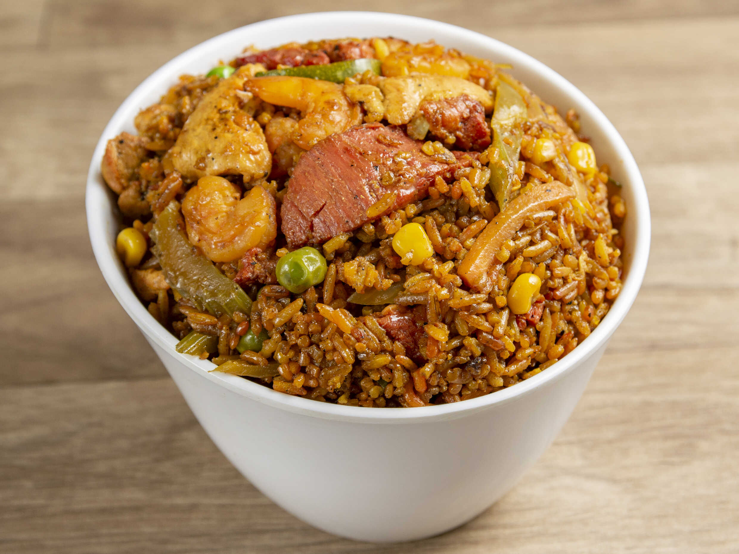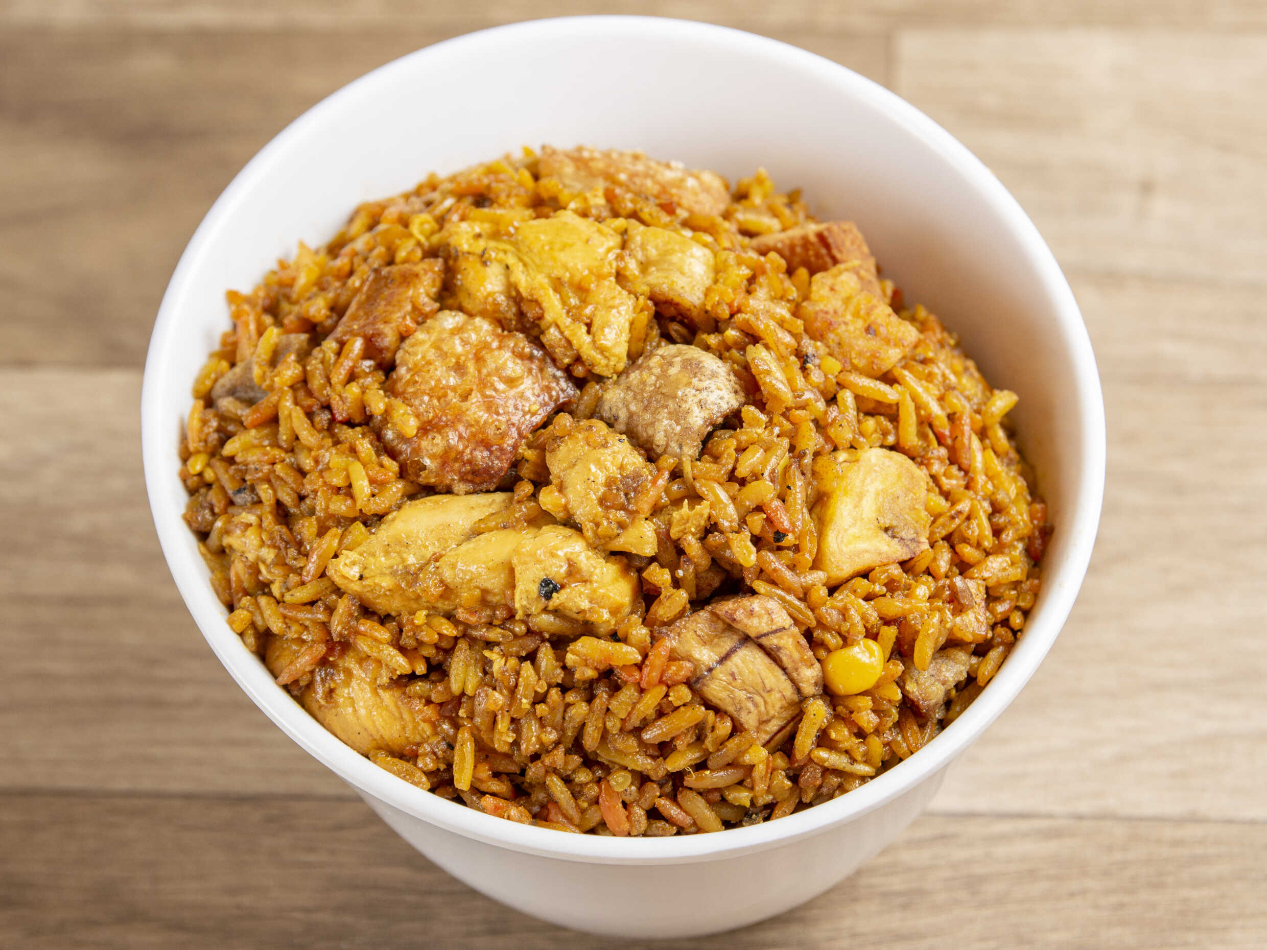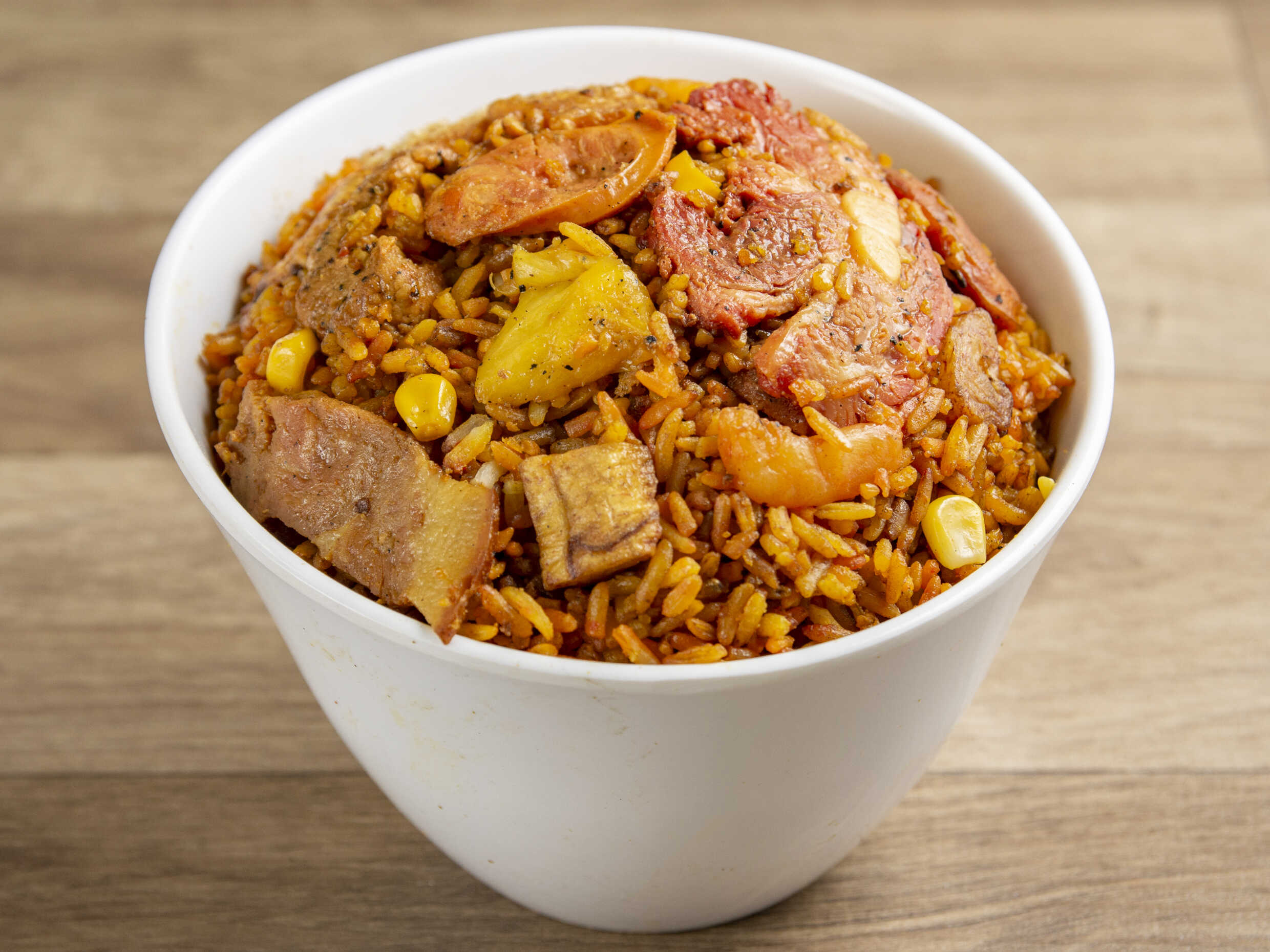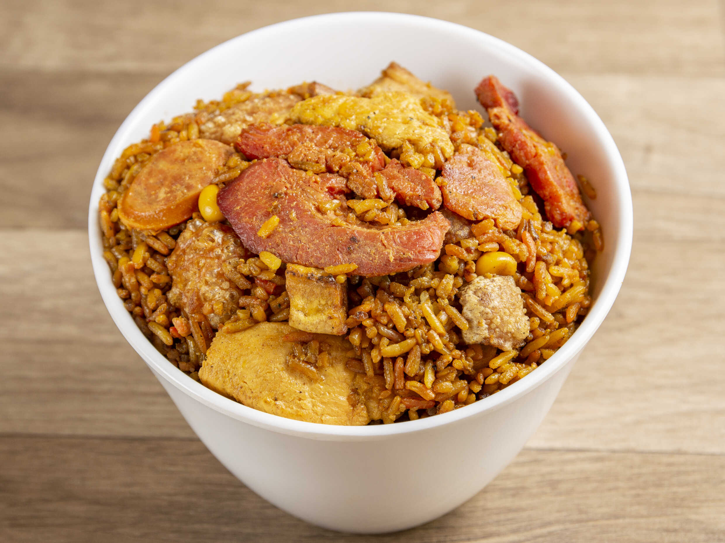 Delicioso Arroz con Pollo, Pernil de Cerdo, Camarón, Raíces Chinas, y Jamón