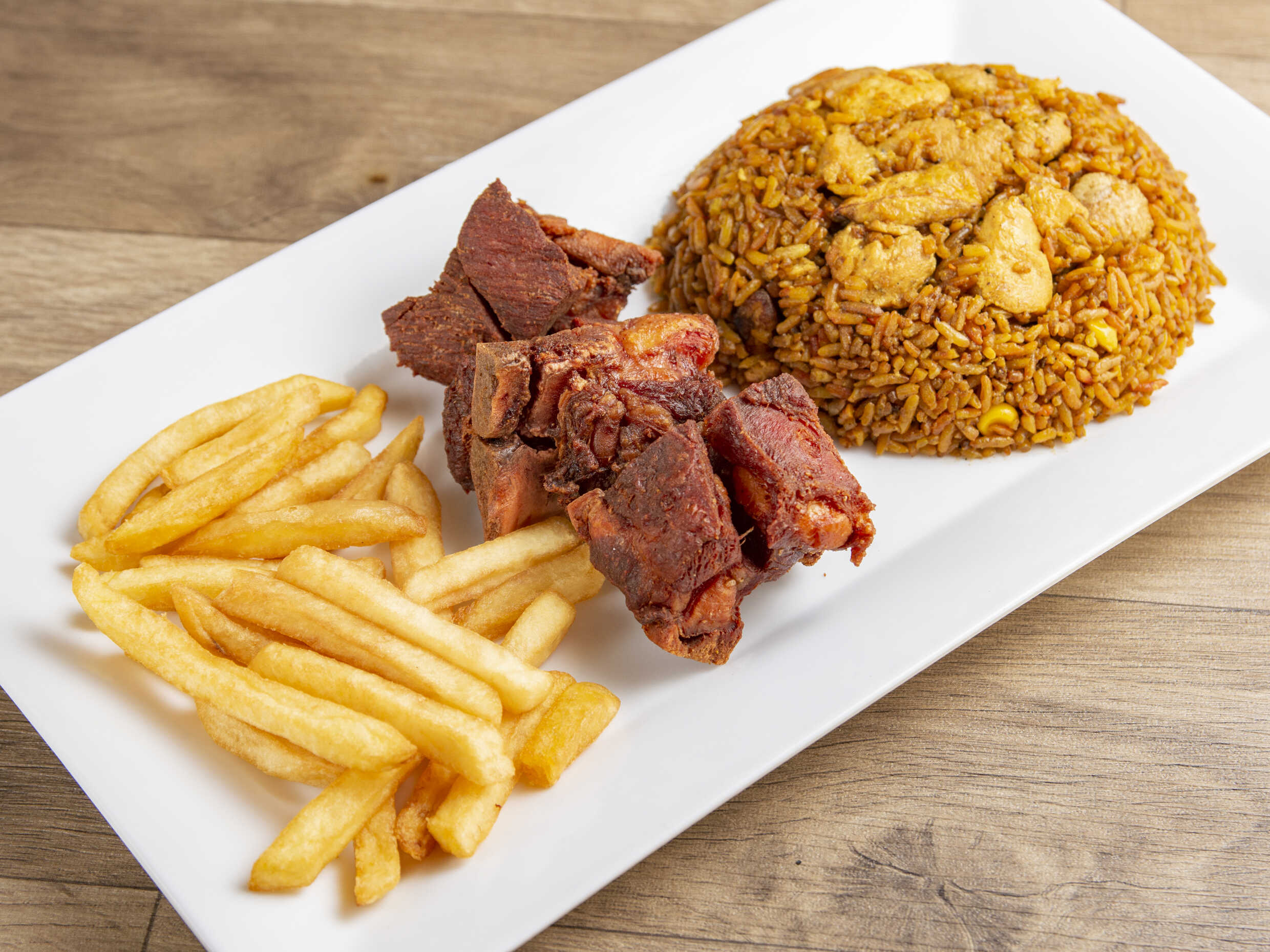Combo tradicional de Chuleta de Pollo o Cerdo con Papa a la Francesa o Chop Suey, con Arroz Paisa o Ranchero