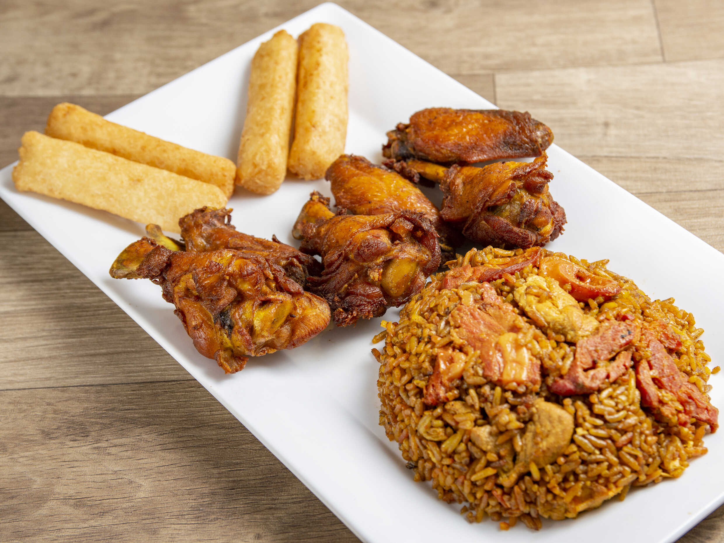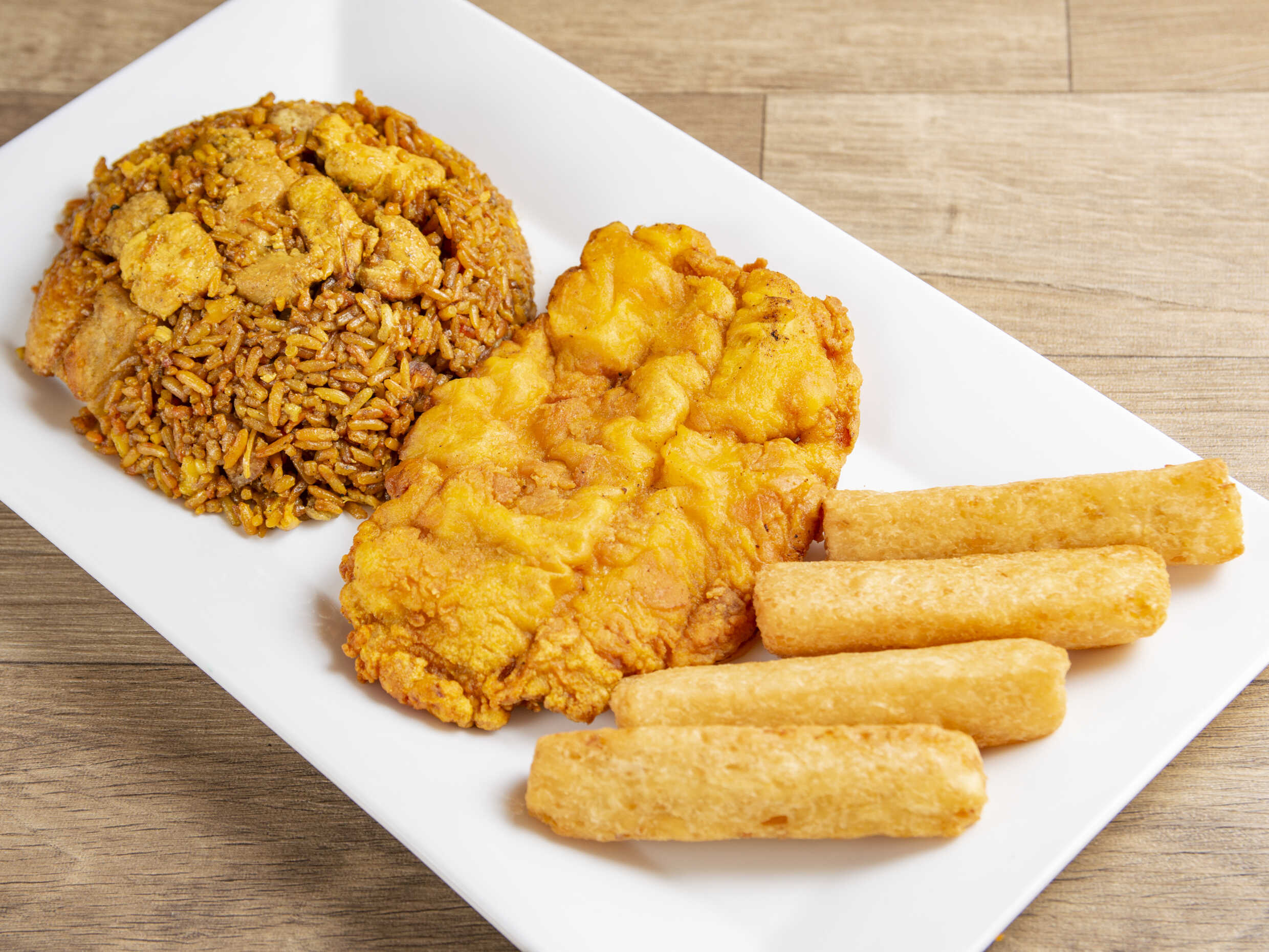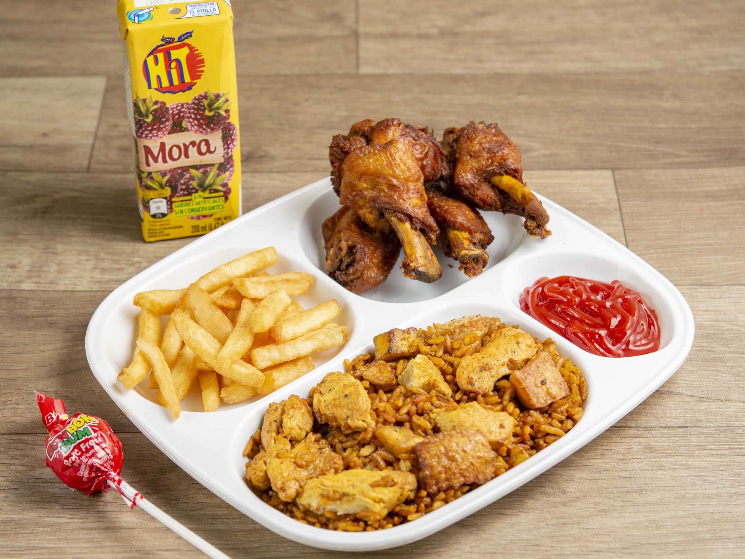 Arroz Paísa + papas francesa o yuca, escoge una proteína (tenders de pollo o alitas) y jugo hit