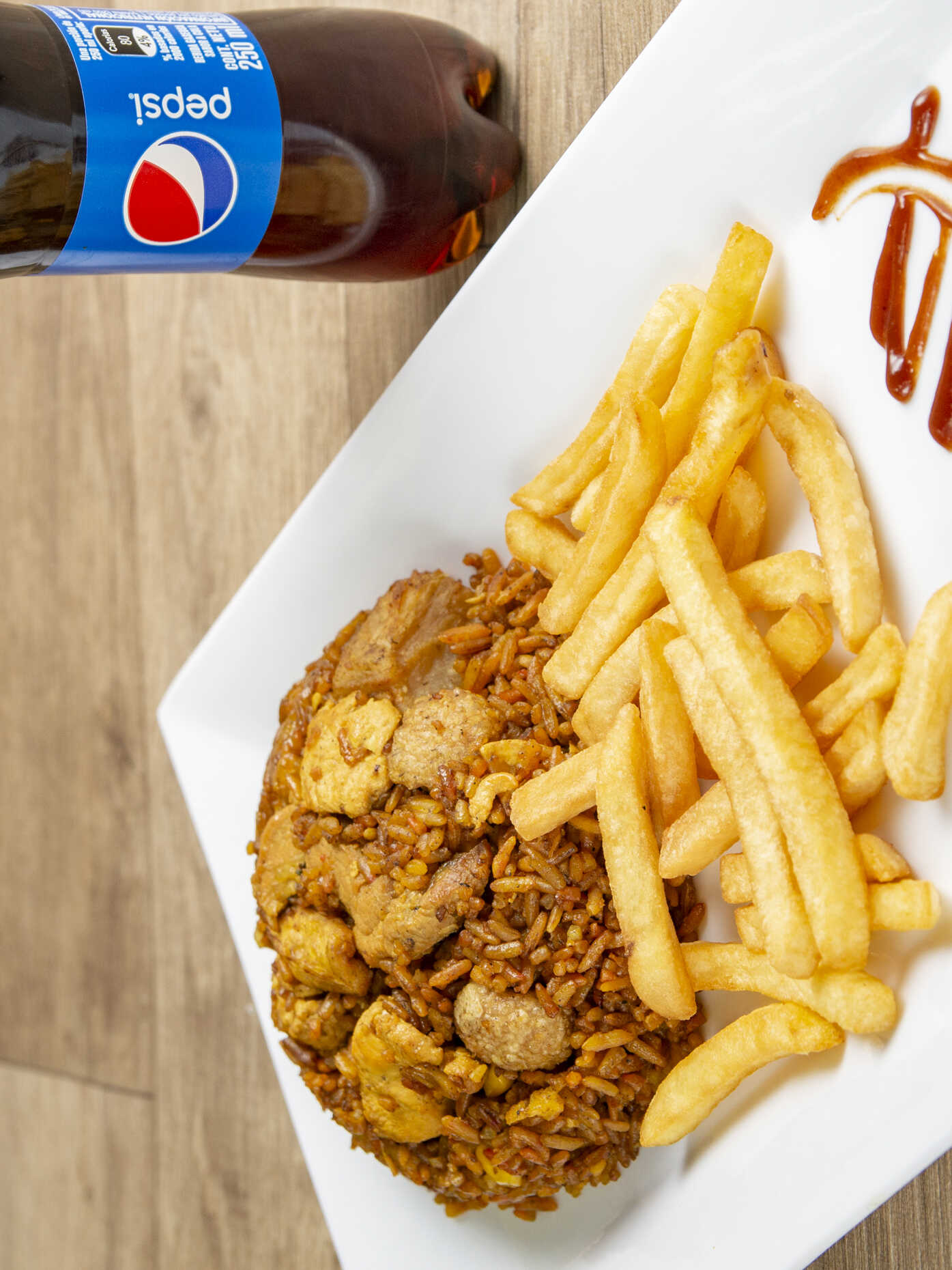200gr de arroz paisa, 100gr de papas a la francesa y 1 gaseosa 250ml (Sabor sujeto a disponibilidad de la sucursal)