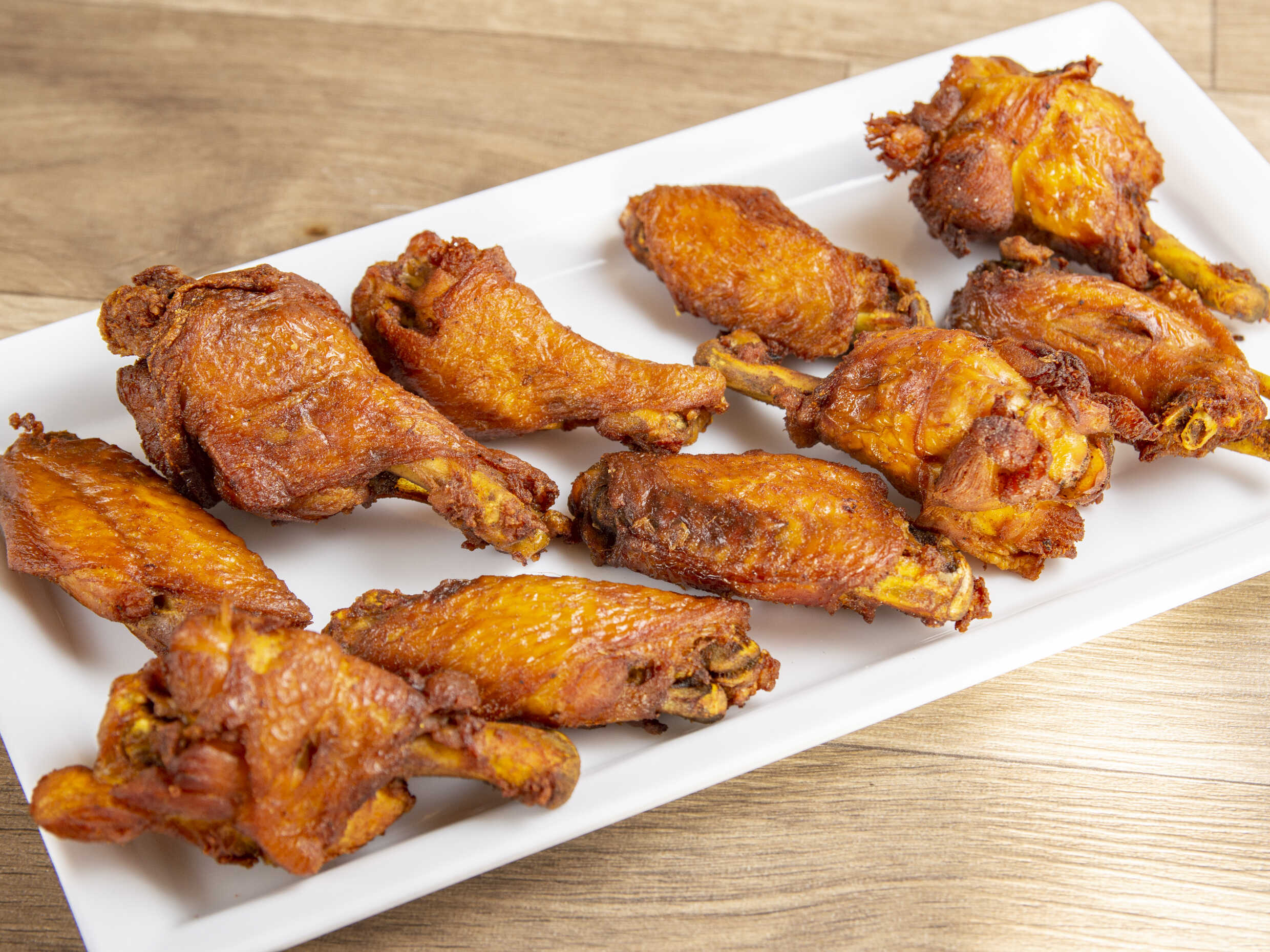 Alitas en salsa BBQ con papa a la francesa, con Arroz Paisa o Ranchero