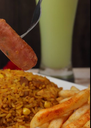Delicioso Arroz con Cerdo, Costilla, Camaron, Chicharron, Tocineta, Chorizo, Piña, Champiñones, Maicitos, Raices y Pasta de Ajo
