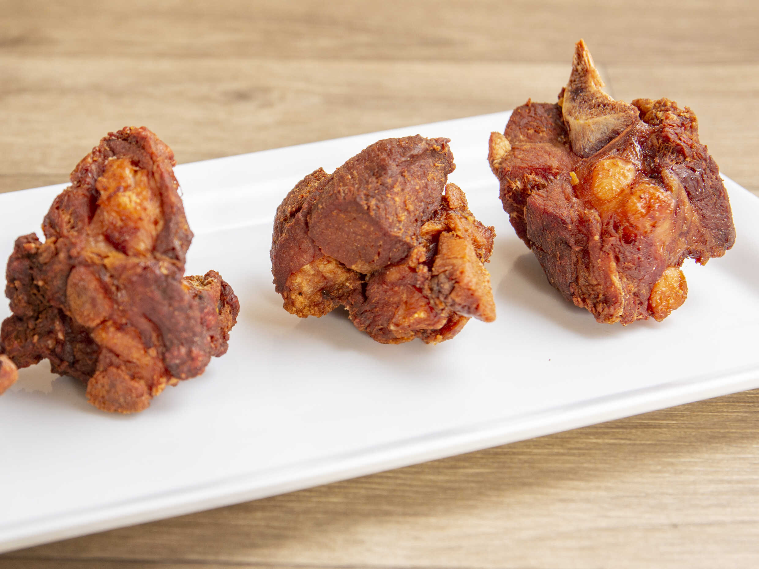 Pollo, pernil de cerdo, chicharrón, plátano maduro y maicitos.