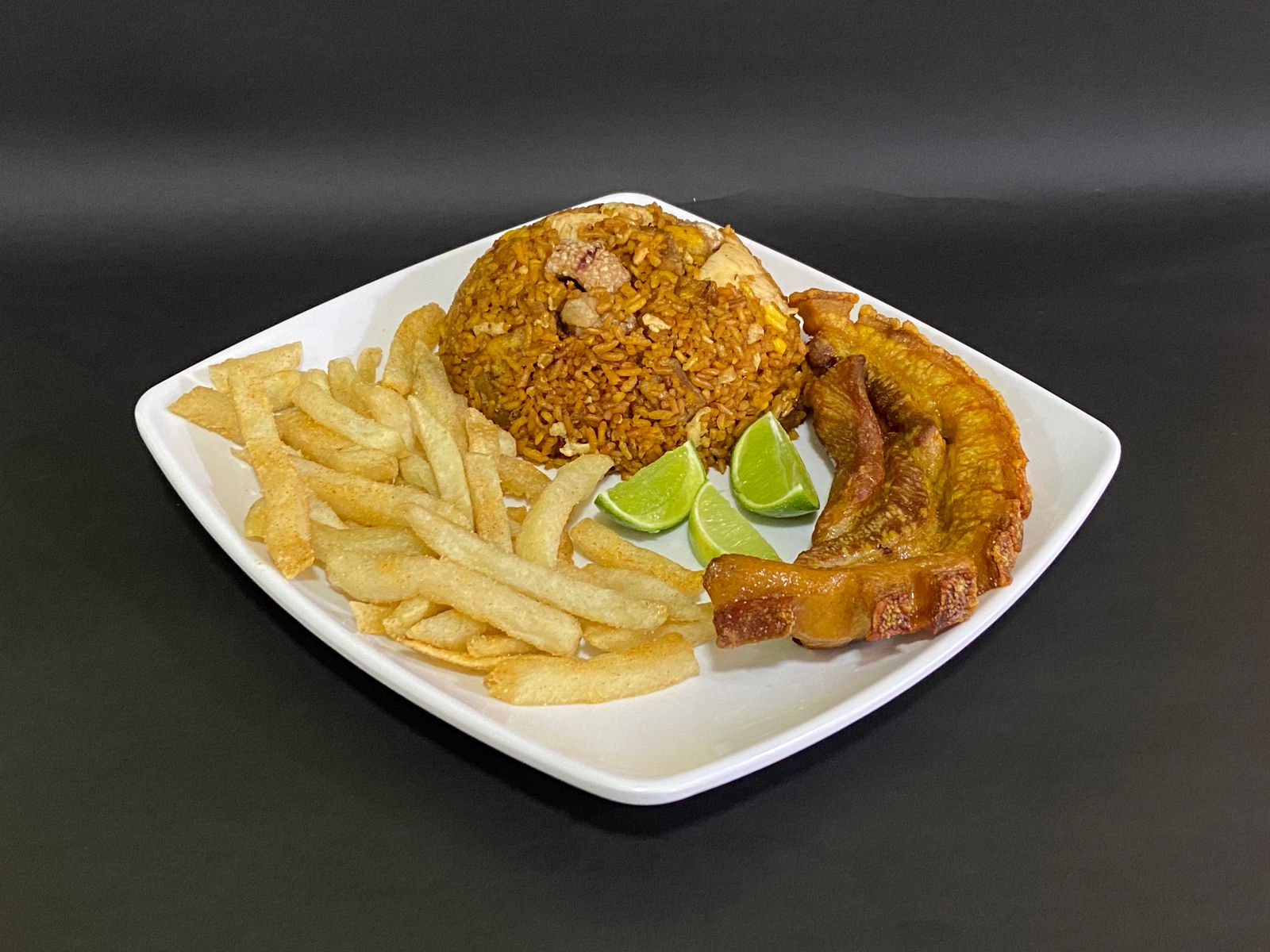 Pollo, cerdo, chicharrón, plátano maduro y maicitos.
