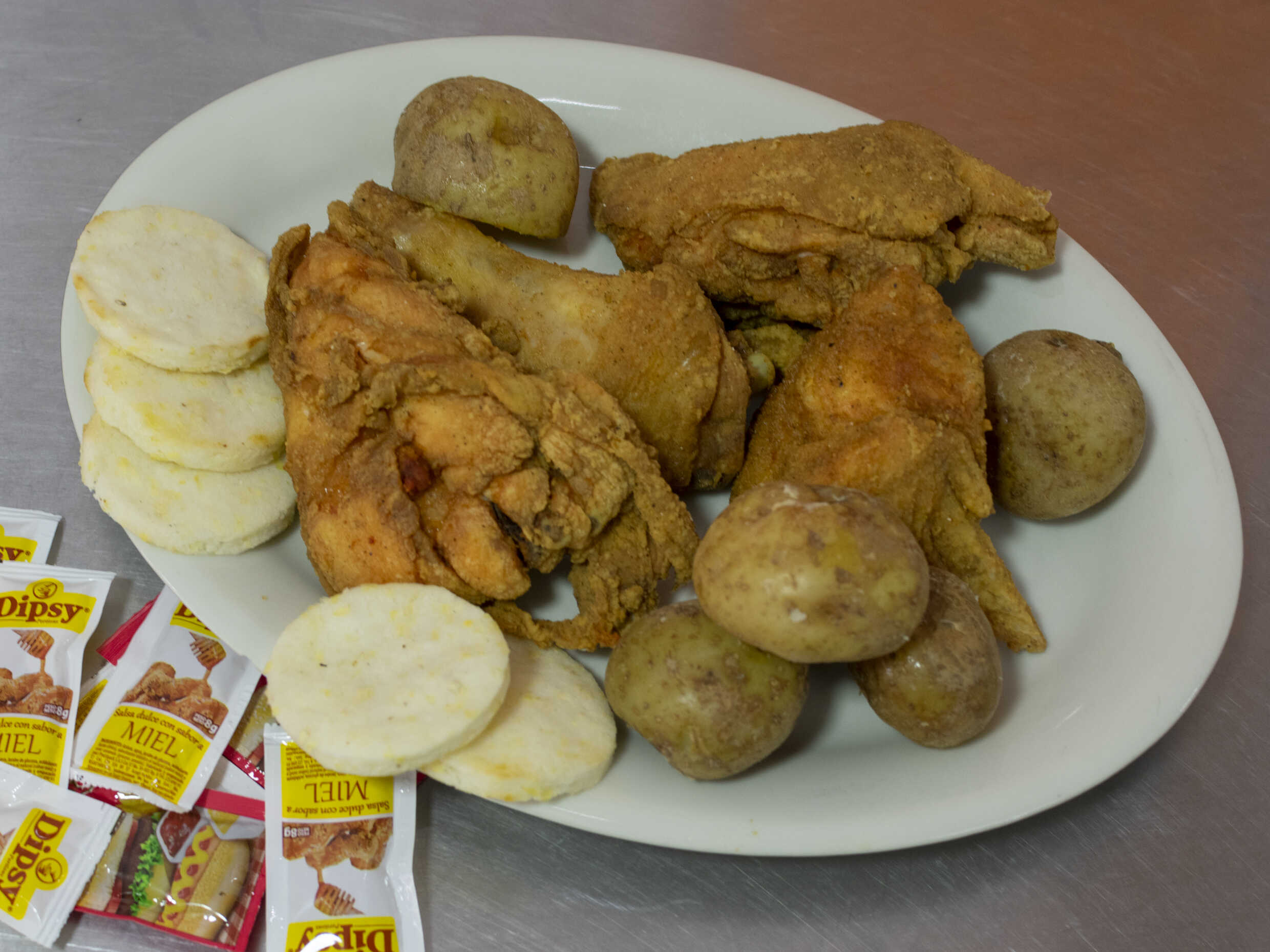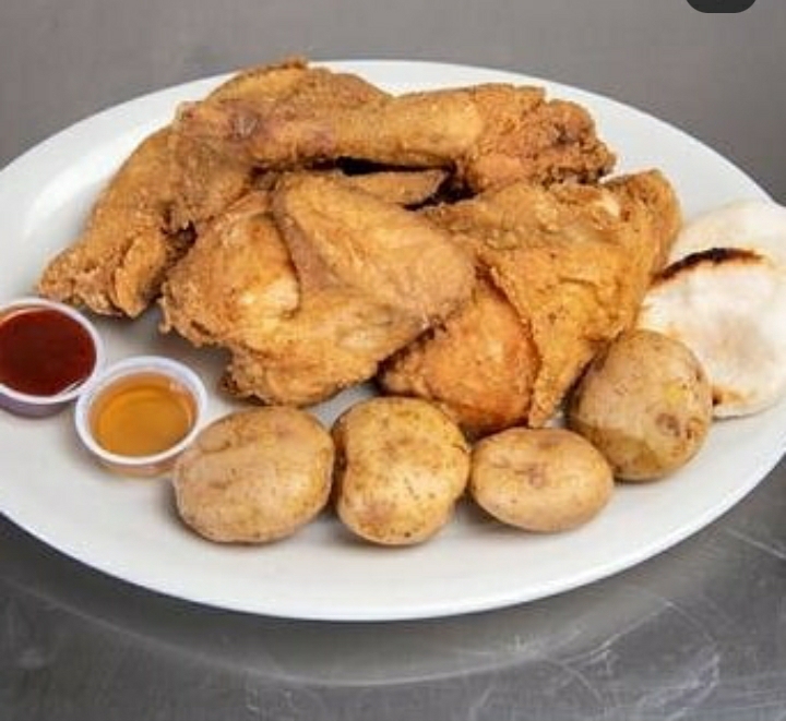 Cuarto de pollo - 2 presas king kong, acompañado de papas y arepas.