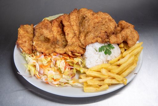 Filete de Pollo King Kong, acompañada de arroz, papa a la francesa, ensalada y sopa del día o Consomé