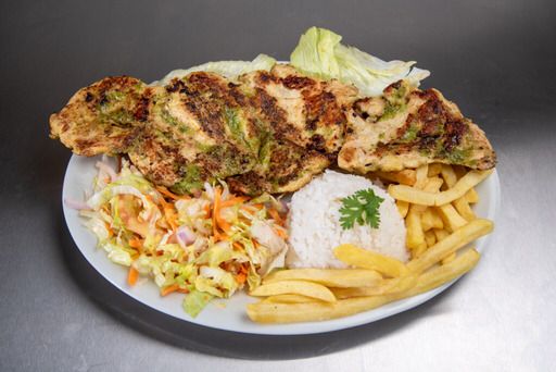 Chuleta de Pollo Especial, acompañada de arroz, papa a la francesa, ensalada y sopa del día o Consomé