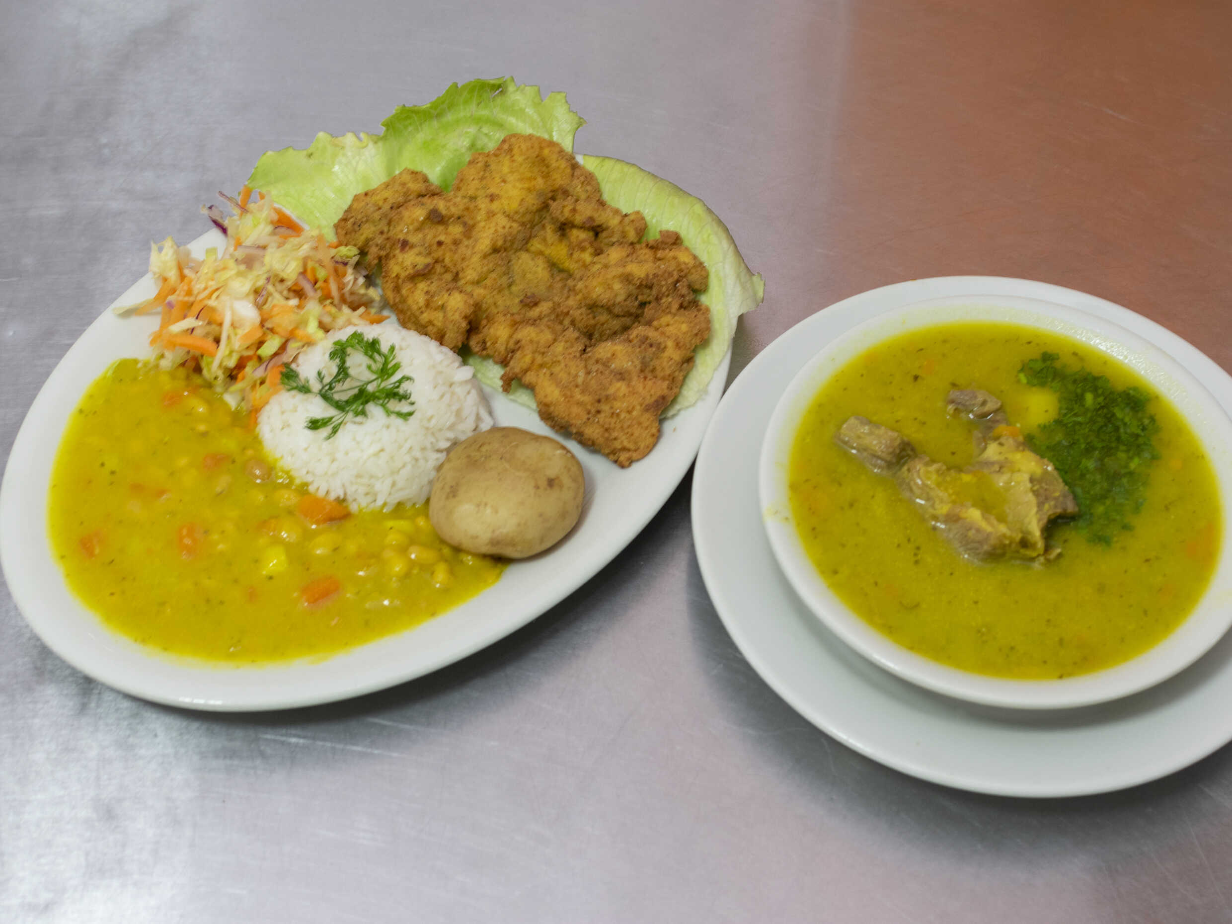 Almuerzo completo con Sopa del día o Consomé, Principio, Proteína a Elección, Arroz, Ensalada y Jugo del Día o Limonada