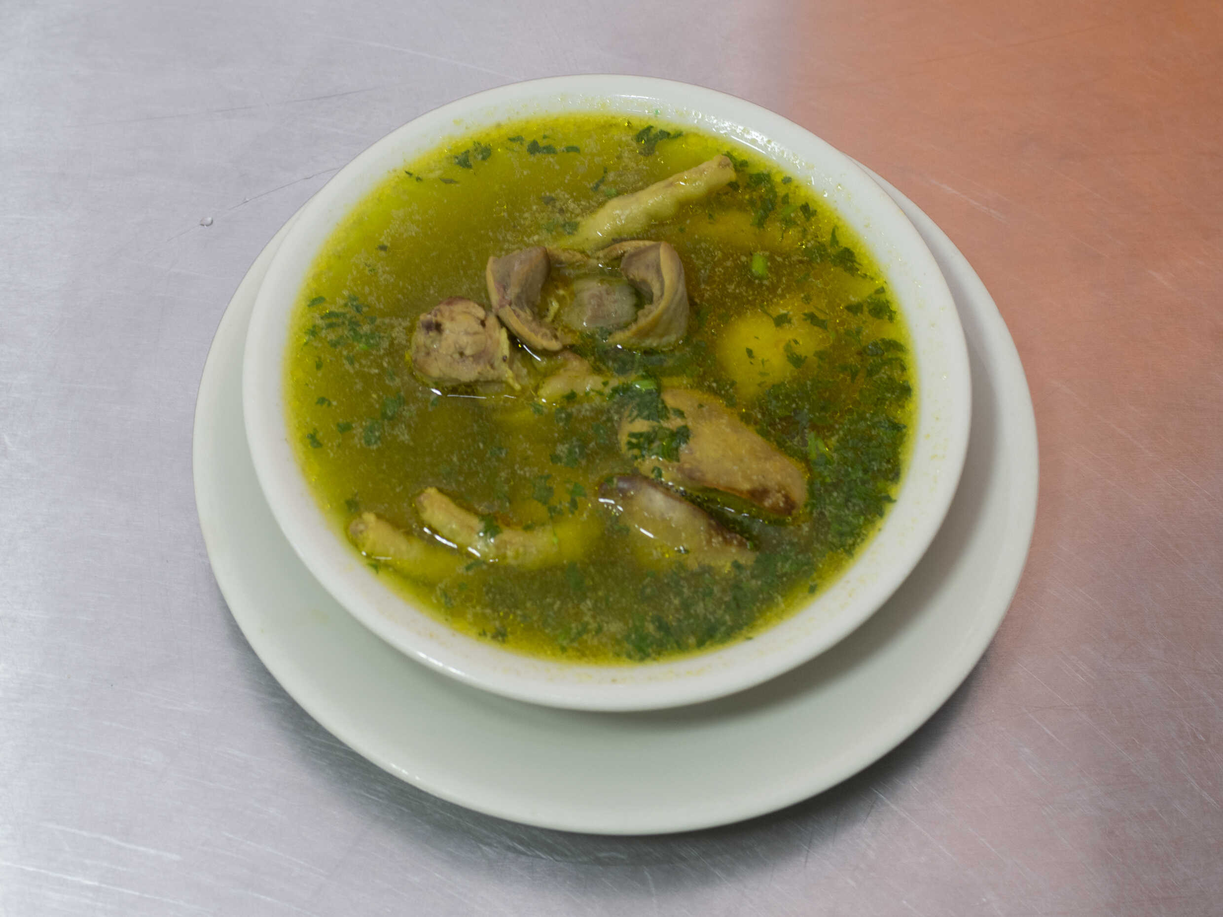 Carne a la Plancha, acompañada de arroz, papa a la francesa, ensalada y sopa del día o Consomé