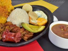 Frijol,arroz,aguacate,chorizo,huevo,chicharrón,carne molida y arepita