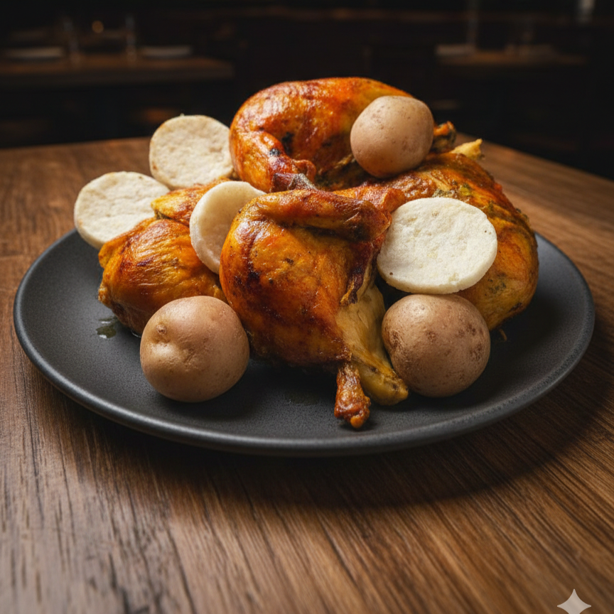 Super Promoción del mes con un combo pollo Entero a Elección (Se puede elegir Pollo Apanado o Asado) más un consomé Pequeño. El pollo viene acompañado de papa cocida y arepa.
