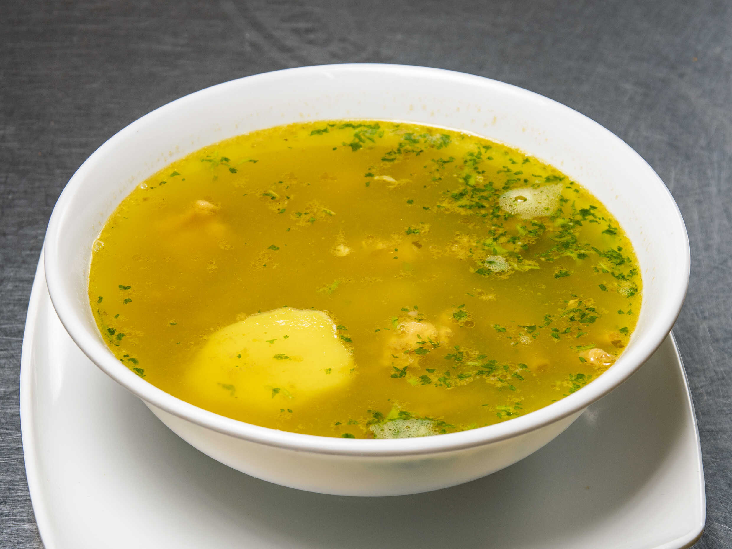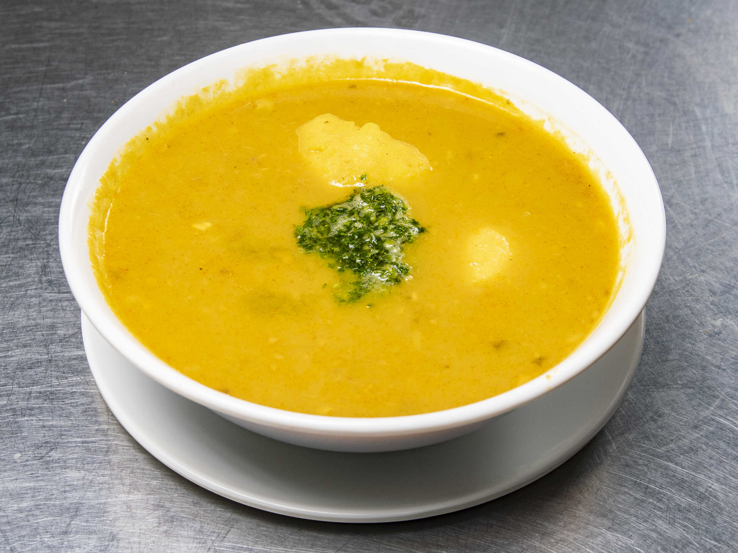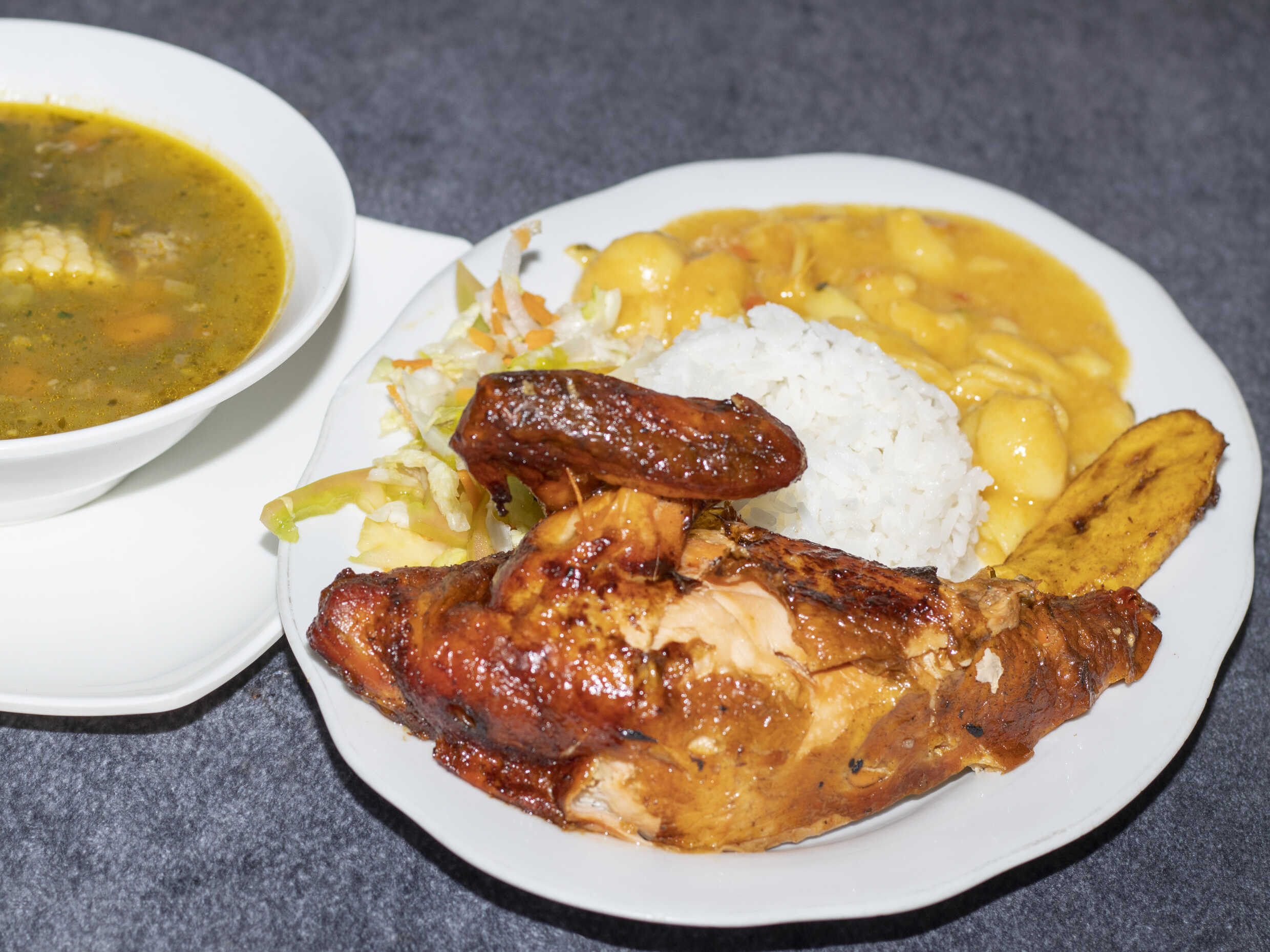 Sopa de 16 oz y principio a eleccion, presa de pollo apanado, arroz blanco, ensalada y tajada madura. Porcion personal