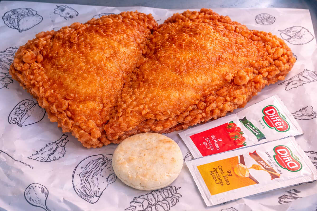 8 pzas De pollo apanado crujiente tipo broaster, acompañadas de 4 arepas y 4 papas.