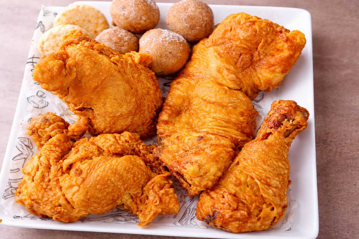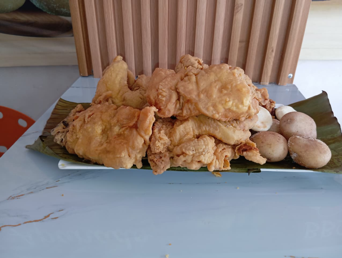 Presa de pollo frita acompañada de arroz oriental, arepa, papa, medio plátano maduro y gaseosa de 250 ml según disponibilidad.