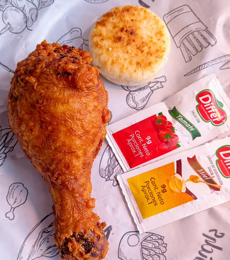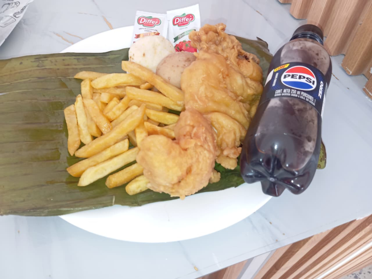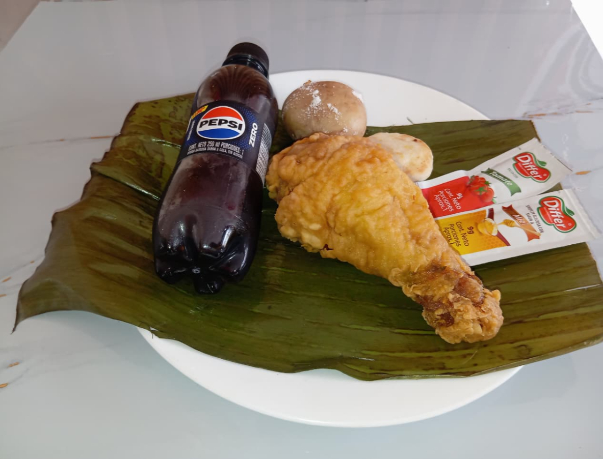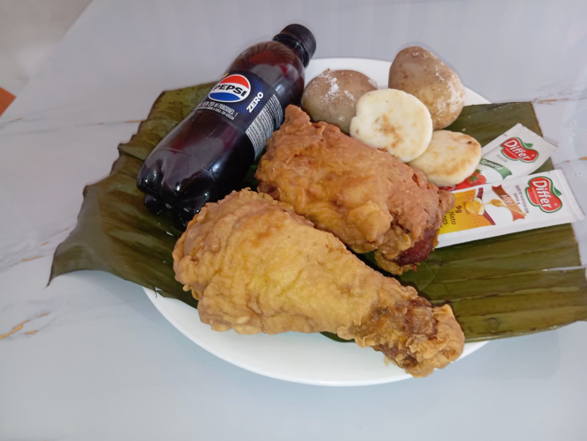Incluye: 1 presa de pollo apanado, 1 papa hervida, 1 arepa, 1 sachet de salsa, y 1 gaseosa (250 ml).