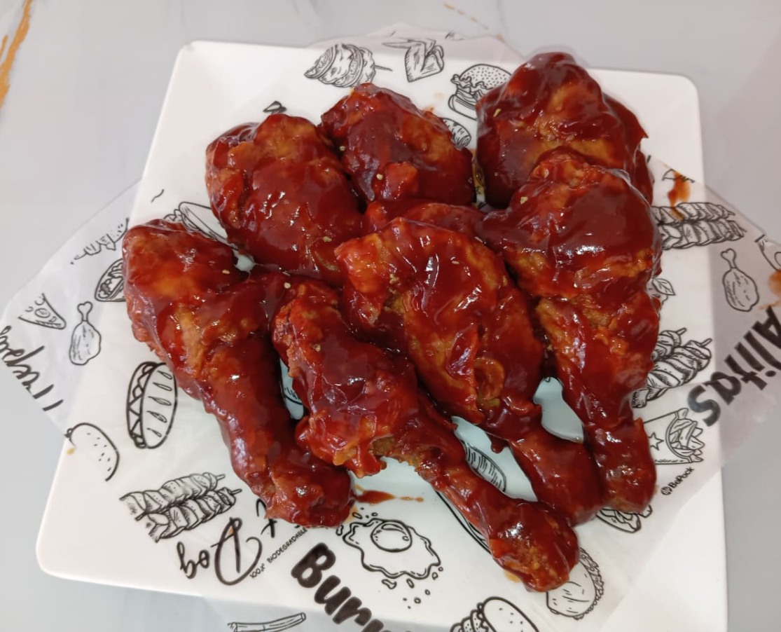 Una pieza de pollo bañada en salsa BBQ, acompañada de una arepa.