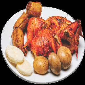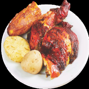 Medio pollo asado a la brasa, servido con 2 arepas, papa cocida y plátano maduro.