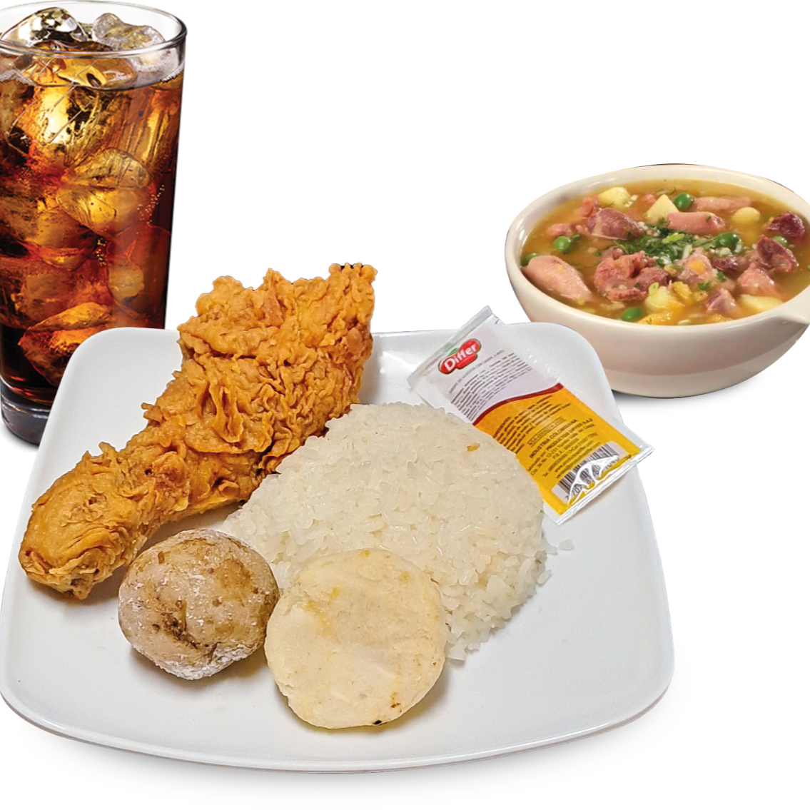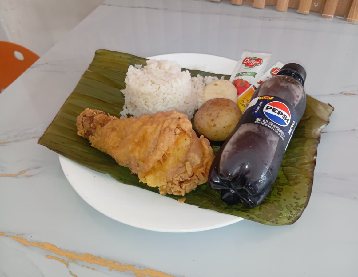 Incluye: 1 presa de pollo apanado, 1 consomé, 1 porción de arroz, 1 papa hervida, 1 arepa, 1 sachet de salsa, y 1 gaseosa (250 ml).