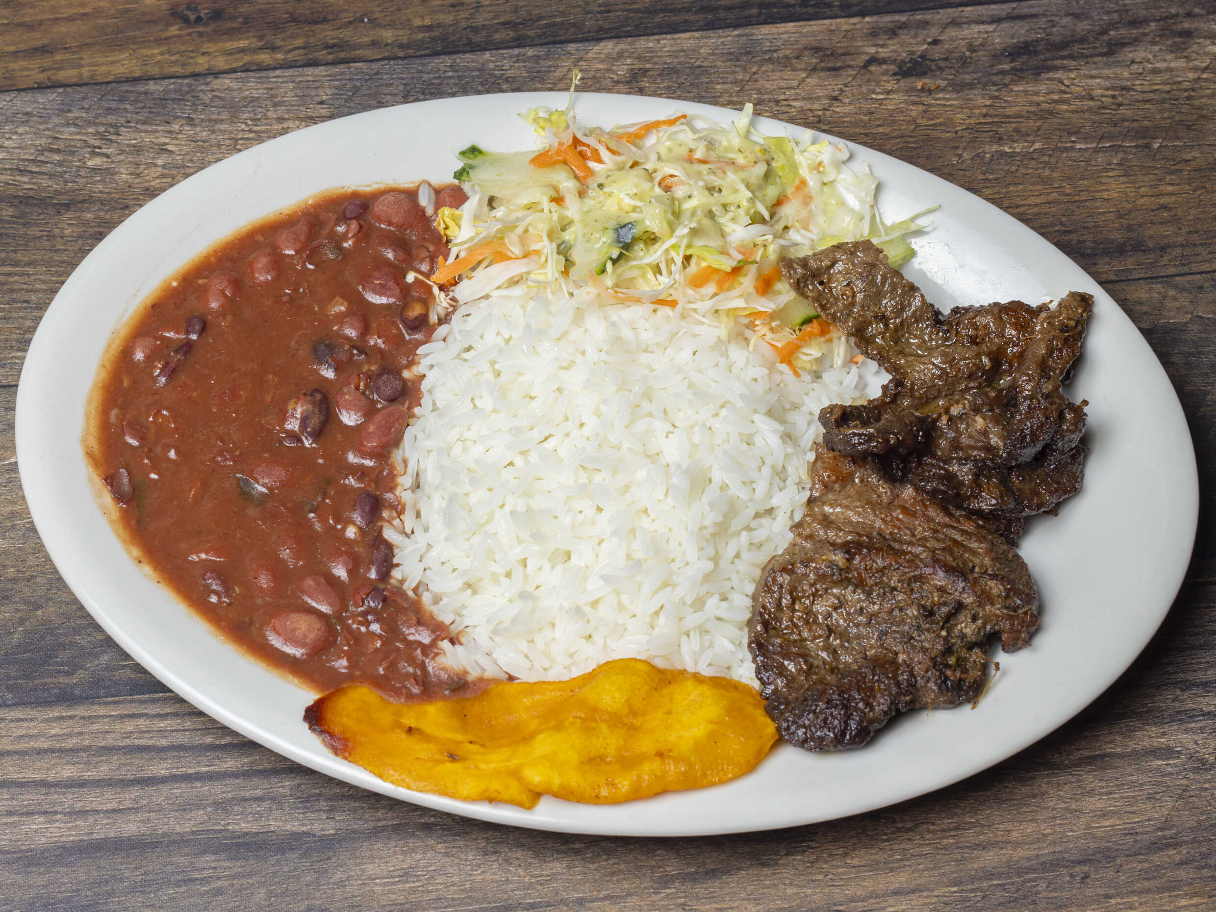 Bandeja con chuleta de cerdo, arroz, ensalada y tajada, acompañada de caldo.