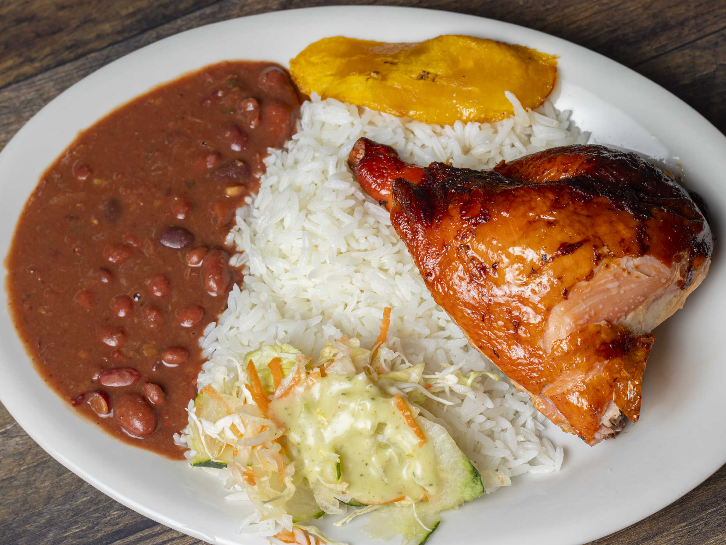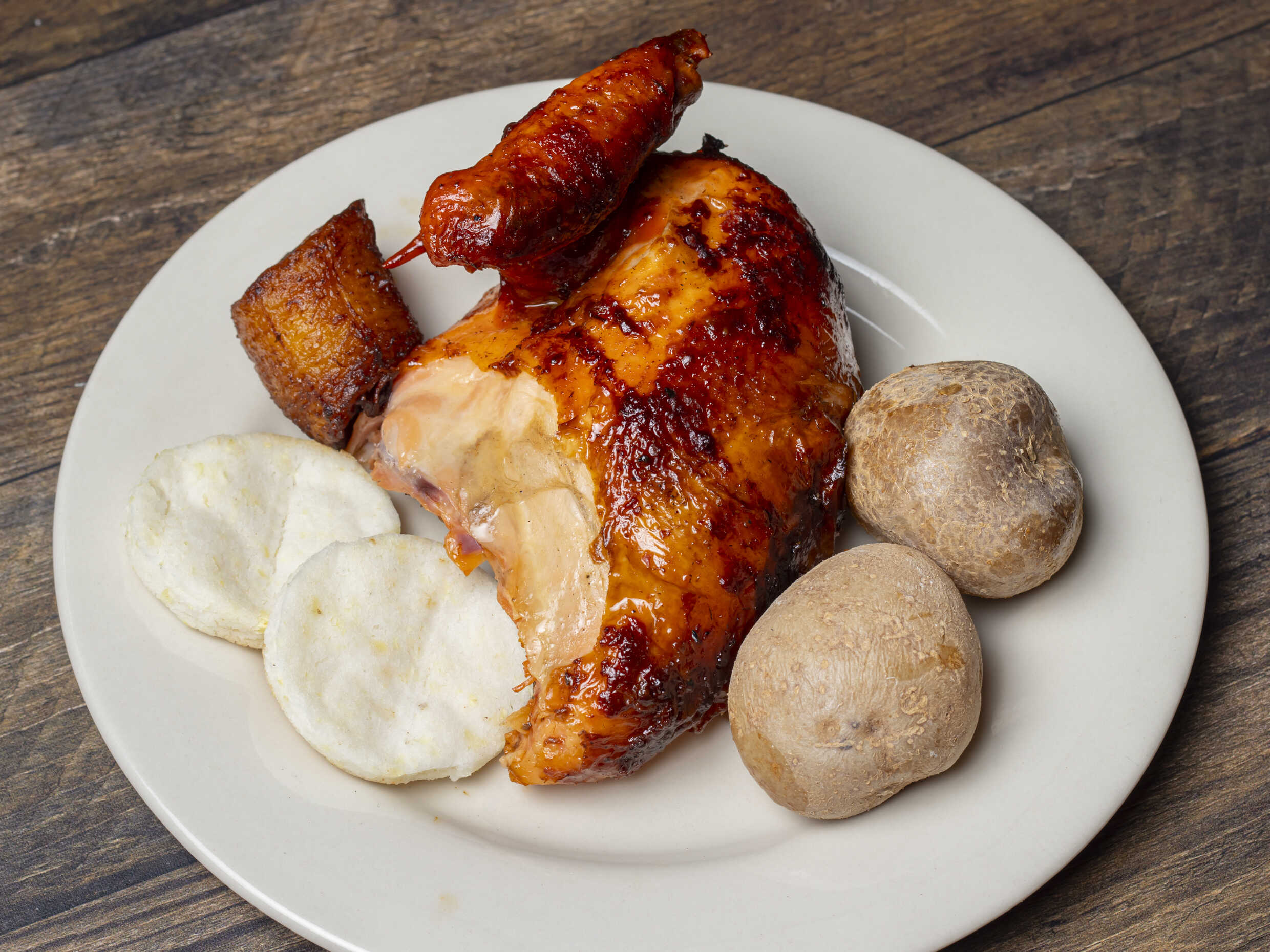 2 Presas de pollo apanado y 2 presas de pollo asado, acompañados de papa cocida, arepa y maduro.