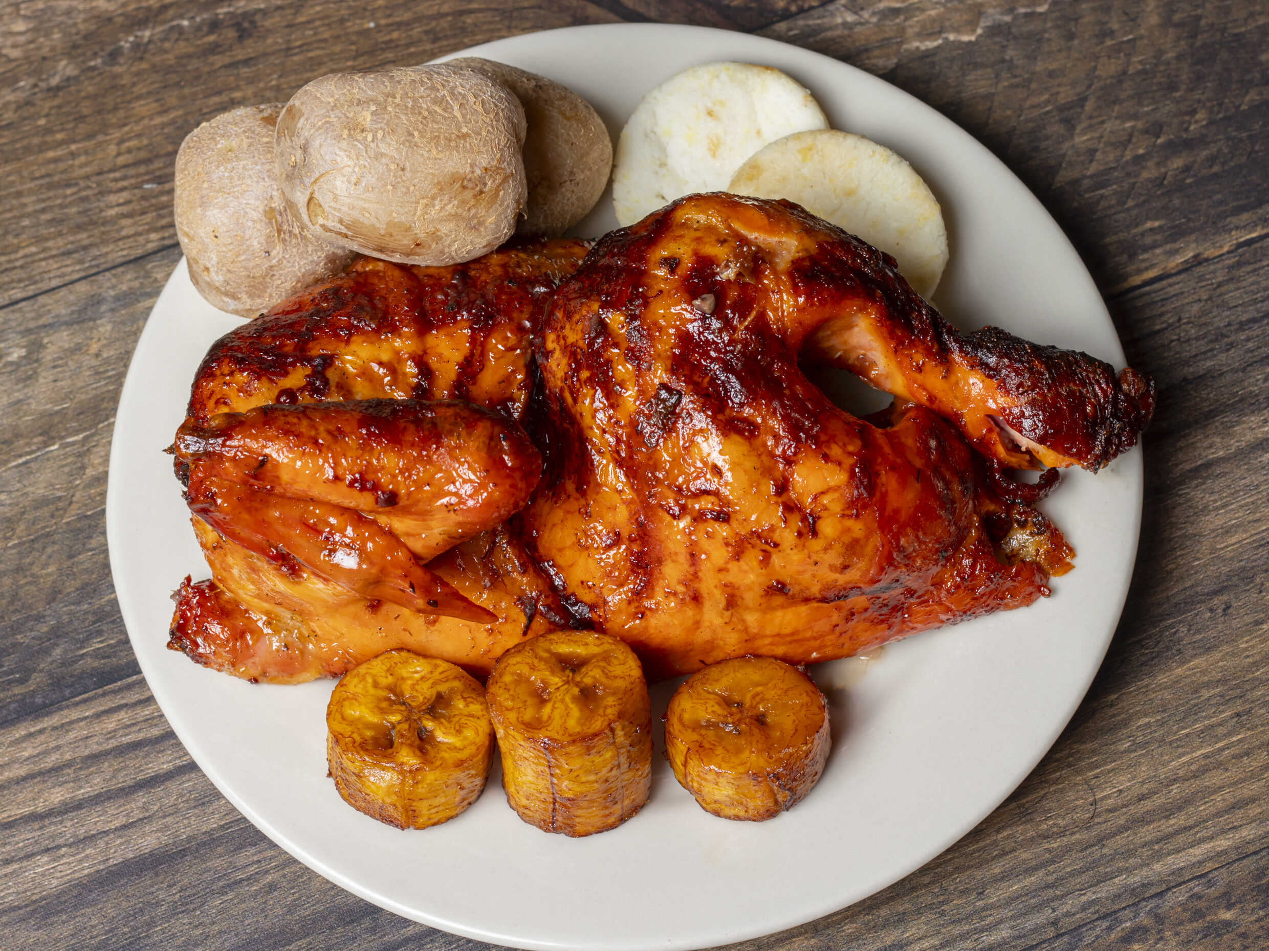4 Presas de pollo apanado y 4 presas de pollo asado, acompañados de papa cocida, arepa y maduro.