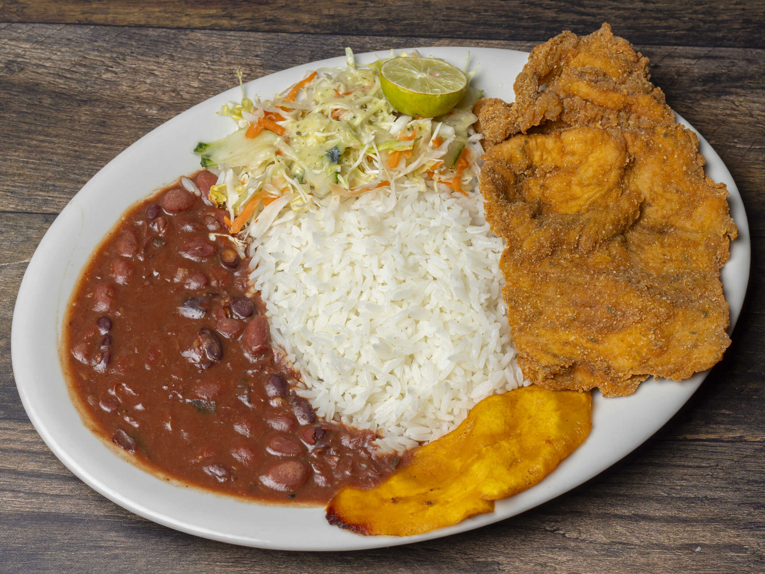 Almuerzo con principio a elección, chuleta de pollo, arroz y ensalada.