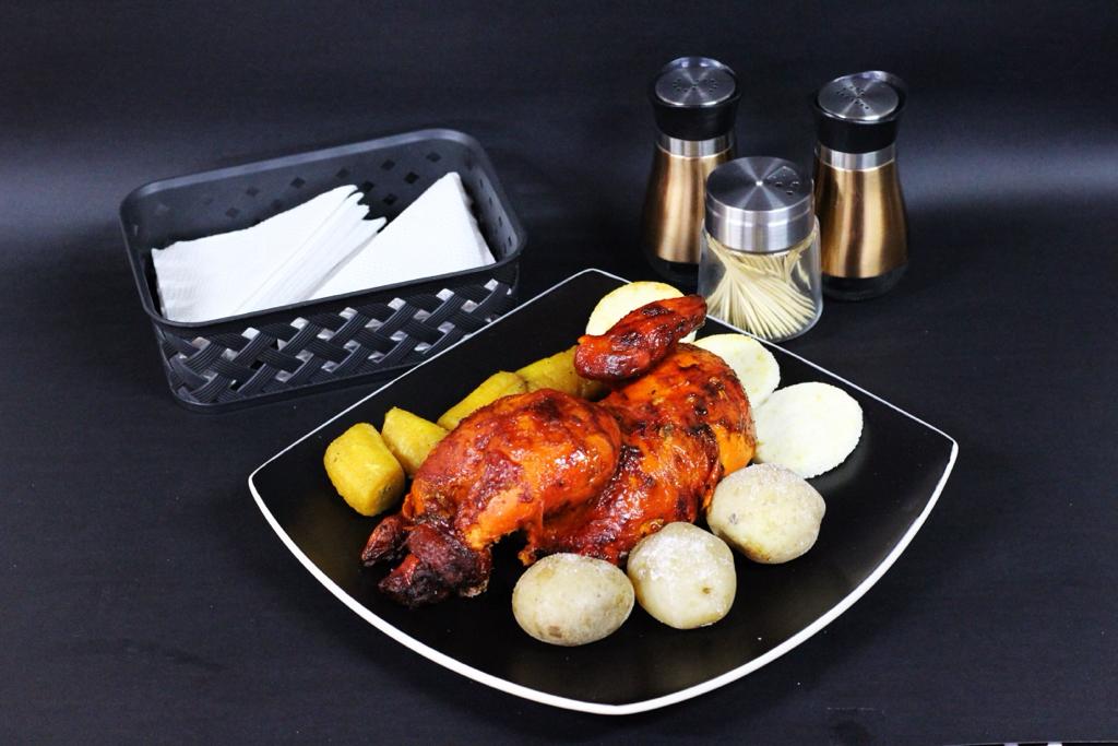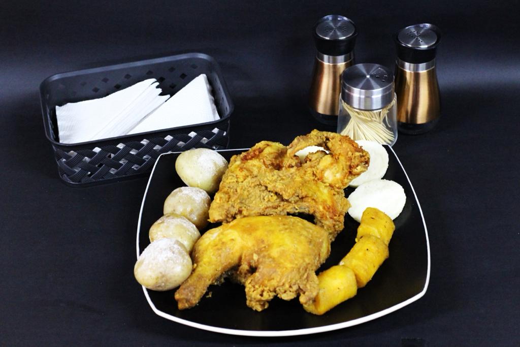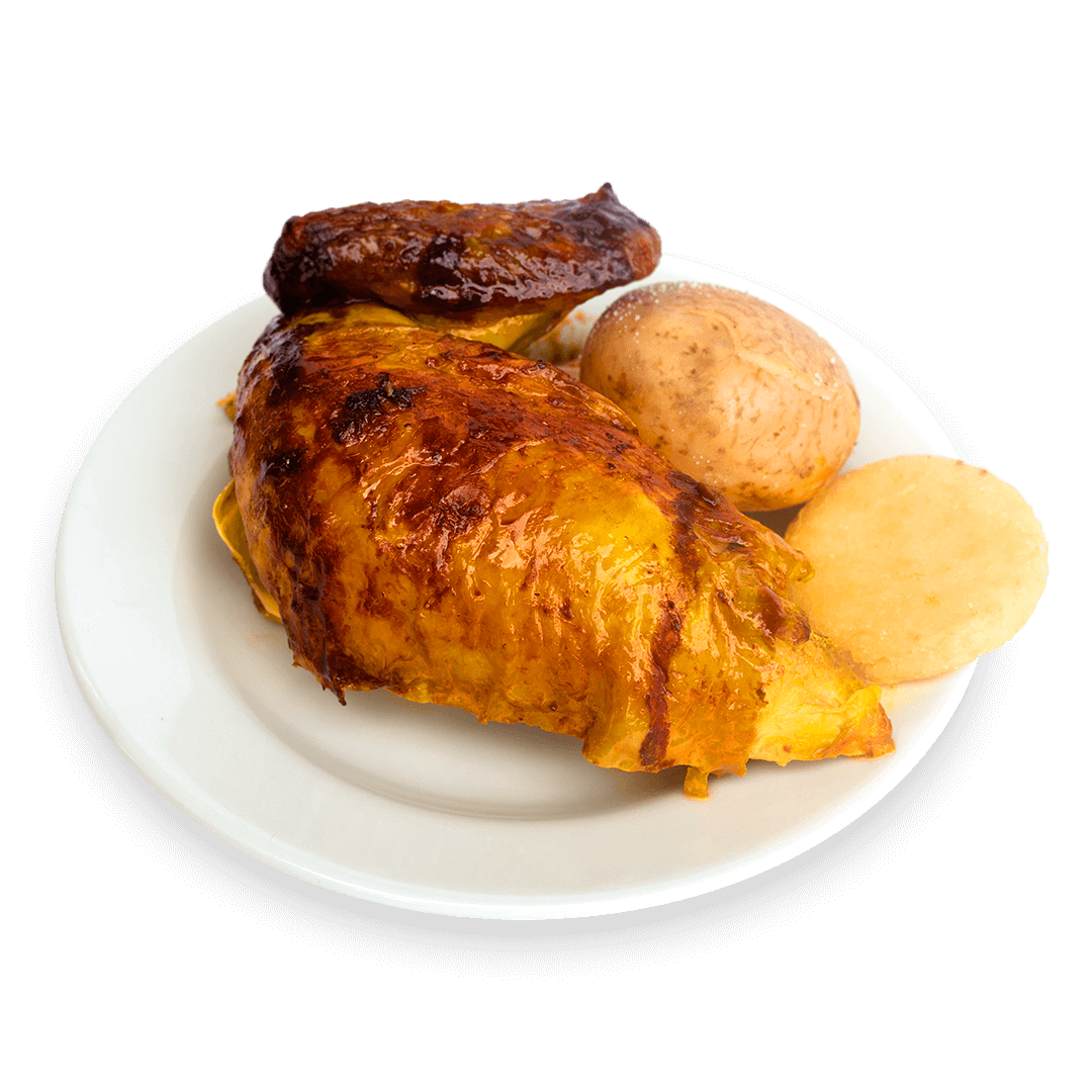 Medio Pollo Asado o Apanado acompañado de papa cocida, arepa, maduro asado y un consome pequeño.