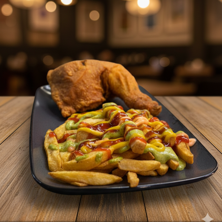 1/4 Pollo Asado o Apanado papa a la francesa, arepa, maduro asado.