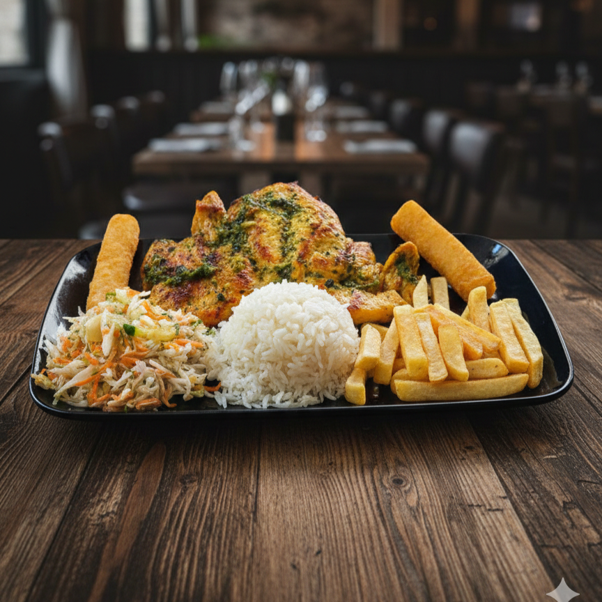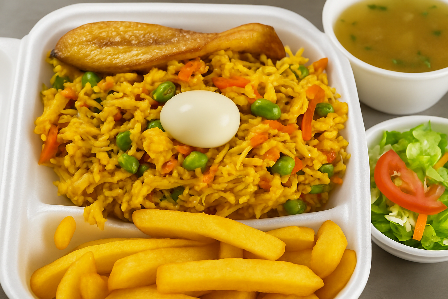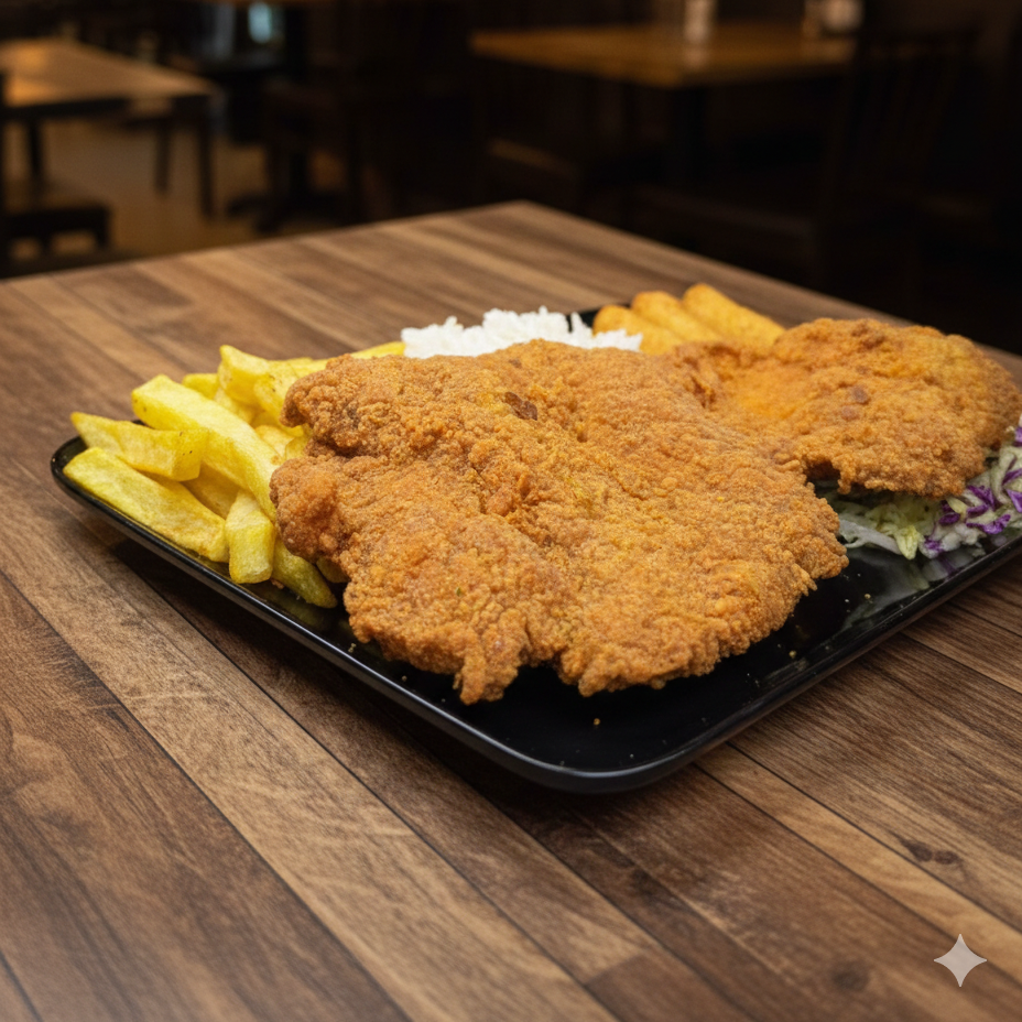 Nuestro delicioso arroz con pollo, sazonado con amor y acompañado de tajada doradita, papas a la francesa, una fresca ensalada del día y sopa a elección. ¡Un almuerzo completo que consiente el paladar y llena el corazón!
